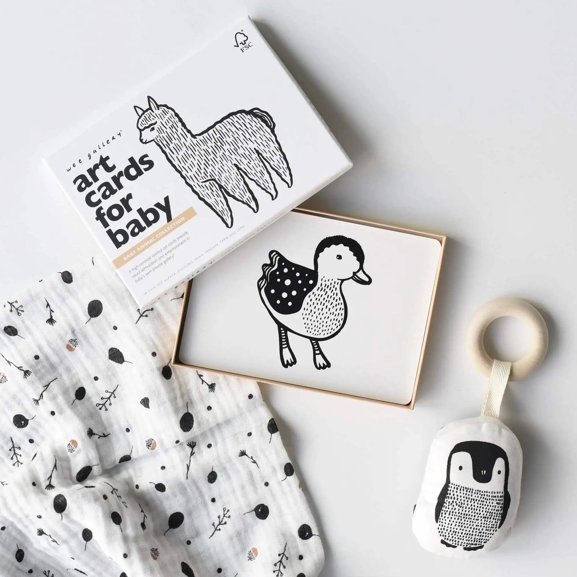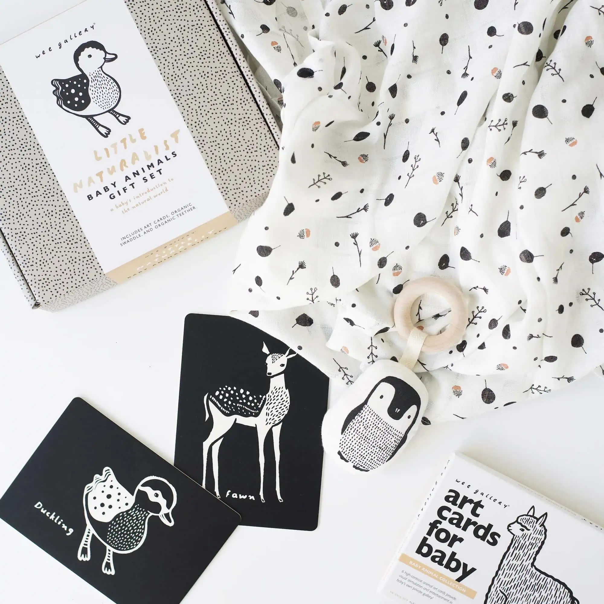 Die Sets sind in einer schönen Wee Gallery Box verpackt und bereit zum Verschenken. Dieses Set beinhaltet einen Bio-Pinguin-Beißring, Kunstkarten der Kollektion Babytiere und ein Musselin-Swaddle „Seedling„.