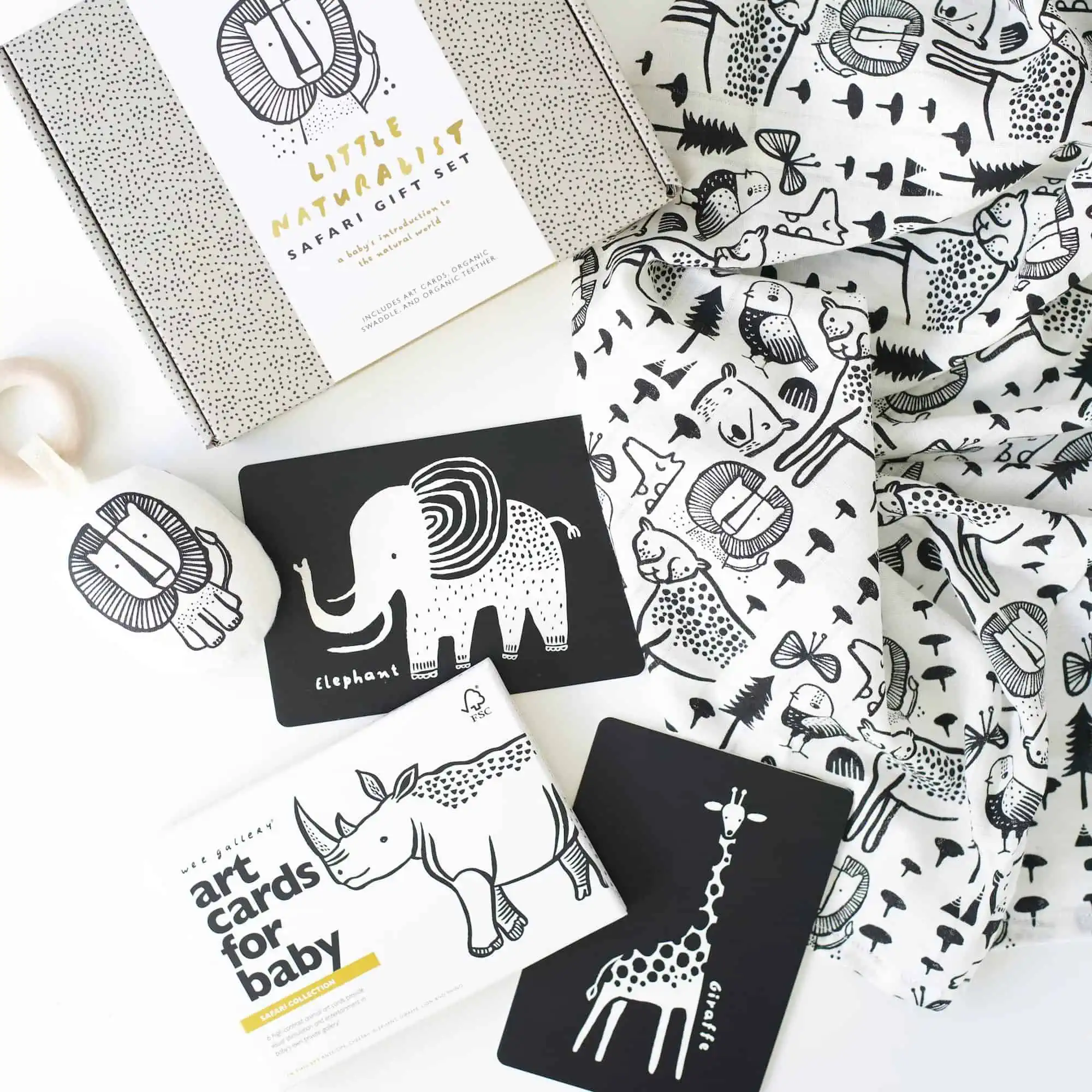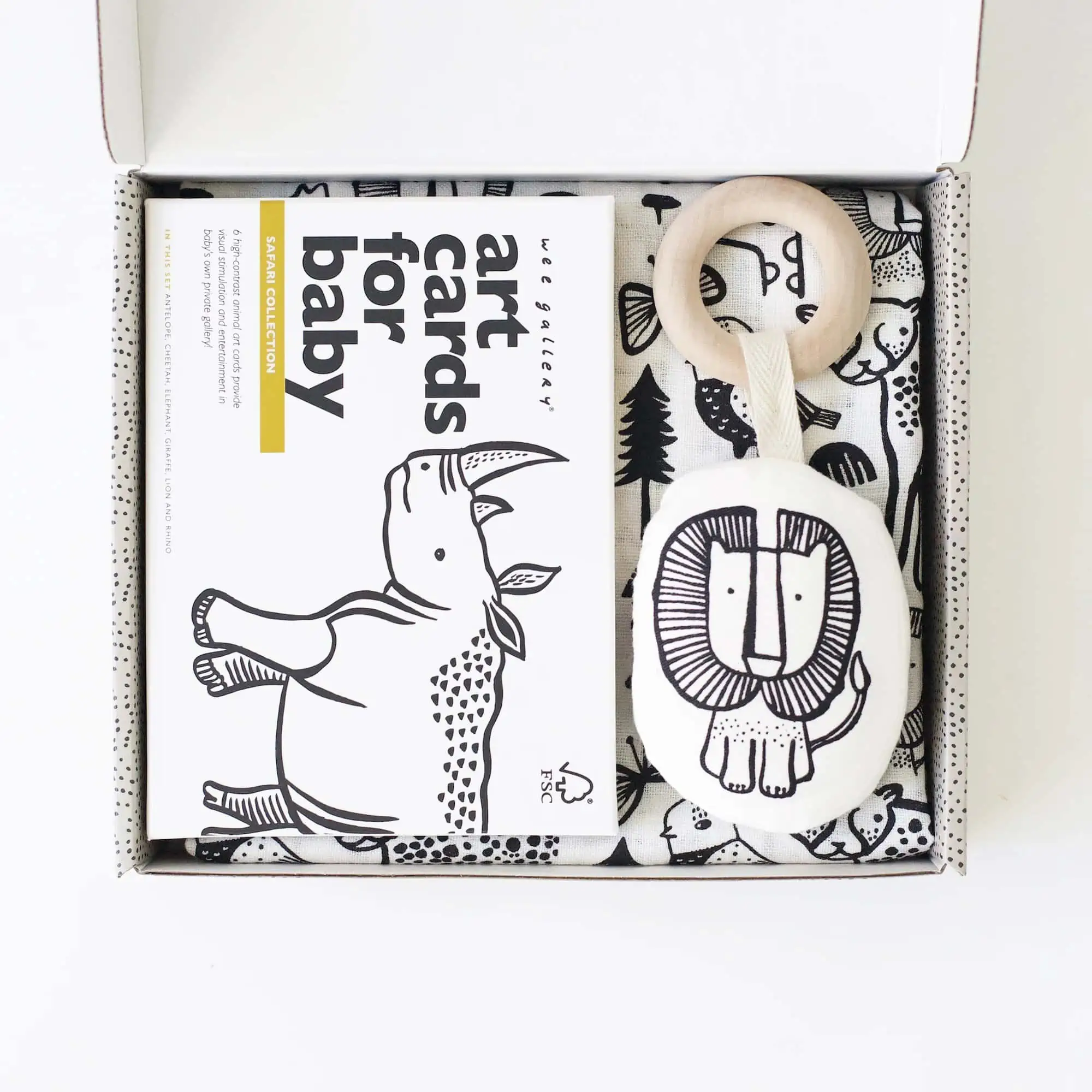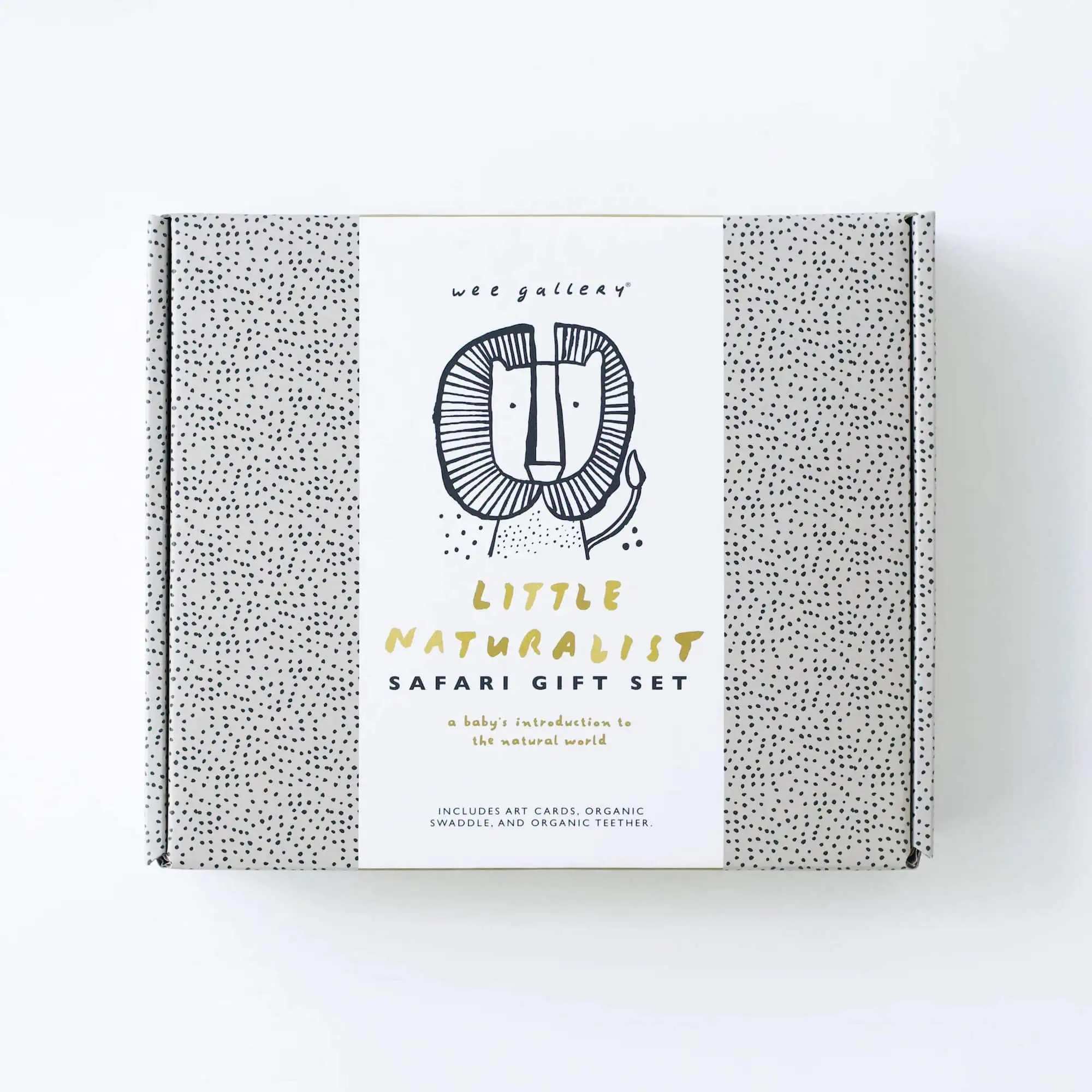 Die Sets sind in einer schönen Wee Gallery Box verpackt und bereit zum Verschenken. Dieses Set beinhaltet einen Bio-Löwen-Beißring, Kunstkarten der Safari-Kollektion und ein Wildes Bio-Musselin-Swaddle.
