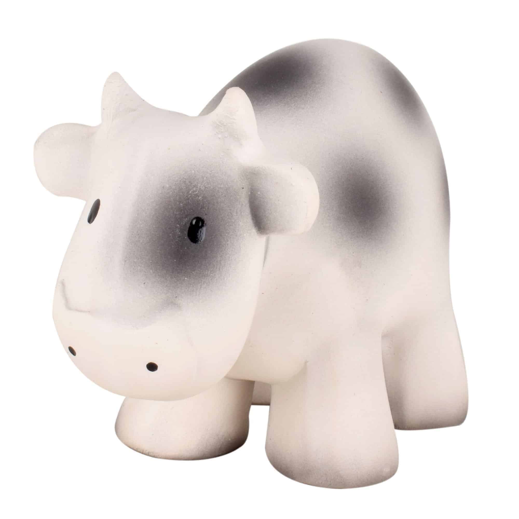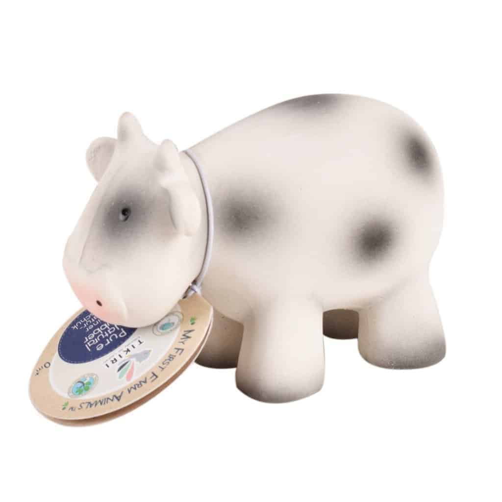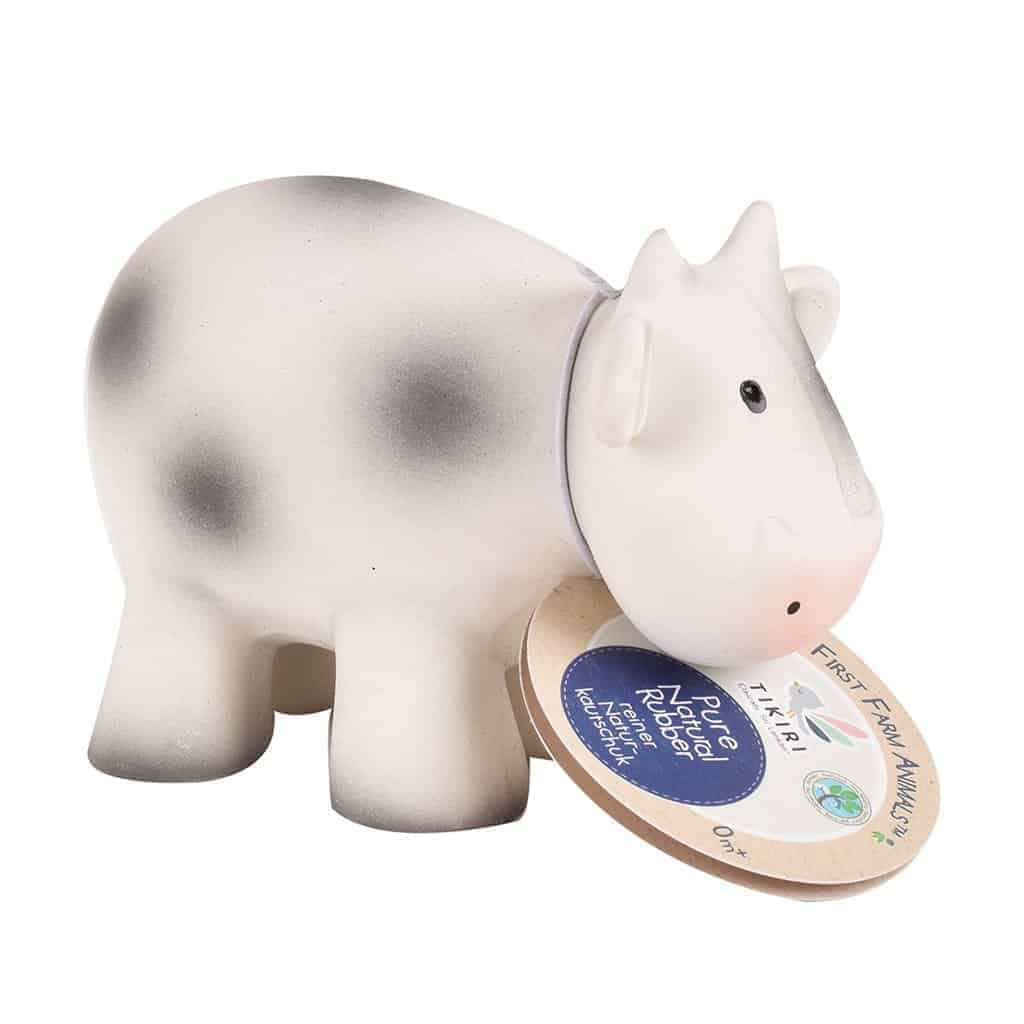 Die Tikiri Rassel Kuh aus der „Meine erste Farm“ Kollektion besteht komplett aus natürlichem Latex und verfügt über eine Textur, die auch kleinen Händen leichtes Greifen und Halten erlaubt. Sie wurde in Handarbeit hergestellt und sogar von Hand bemalt. Das macht sie zu einem echten Unikat! Das Tier ist 9  cm lang, 9 cm hoch und trägt eine Rassel im Körper, die beim Schütteln ein sanftes Geräusch erzeugt.