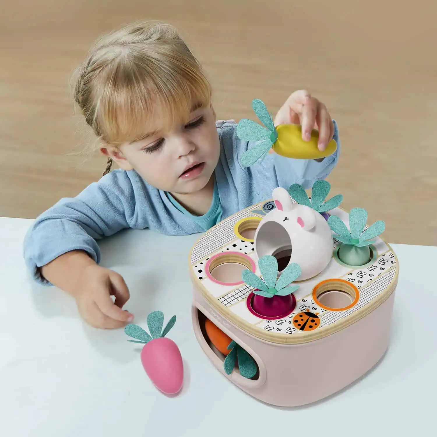 Das TOPBRIGHT Sortierspiel Karotten fördert spielerisch die Feinmotorik und Farberkennung bei Kleinkindern ab 12 Monaten. Mit bunten Holzkarotten und süßem Hasen-Design.