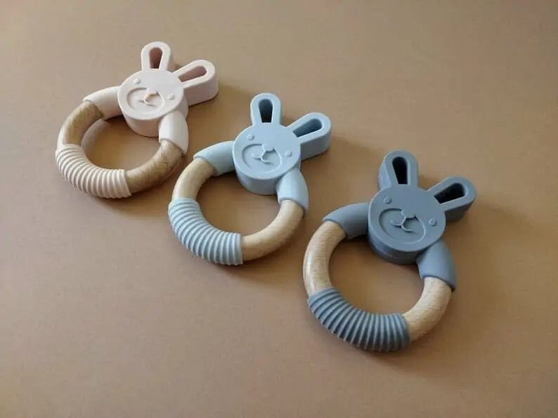 Beißring in Hasenform aus Massivholz mit Silikonperlen. Perfekt geeignet für zahnende Kinder. Design und Produktion in Deutschland.