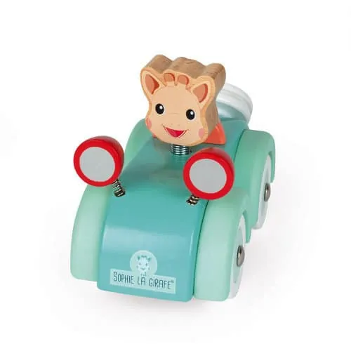 Sophie, die Giraffe, ist in Frankreich seit über 50 Jahren als Spielzeug, das alle Sinne des Babys fördert, ein absoluter Hit. Hier steuert sie ein kleines Holzauto, das bei Kindern die Entwicklung der Feinmotorik fördert. Sophies Kopf und die Scheinwerfer wackeln beim Rollen lustig vor und zurück.