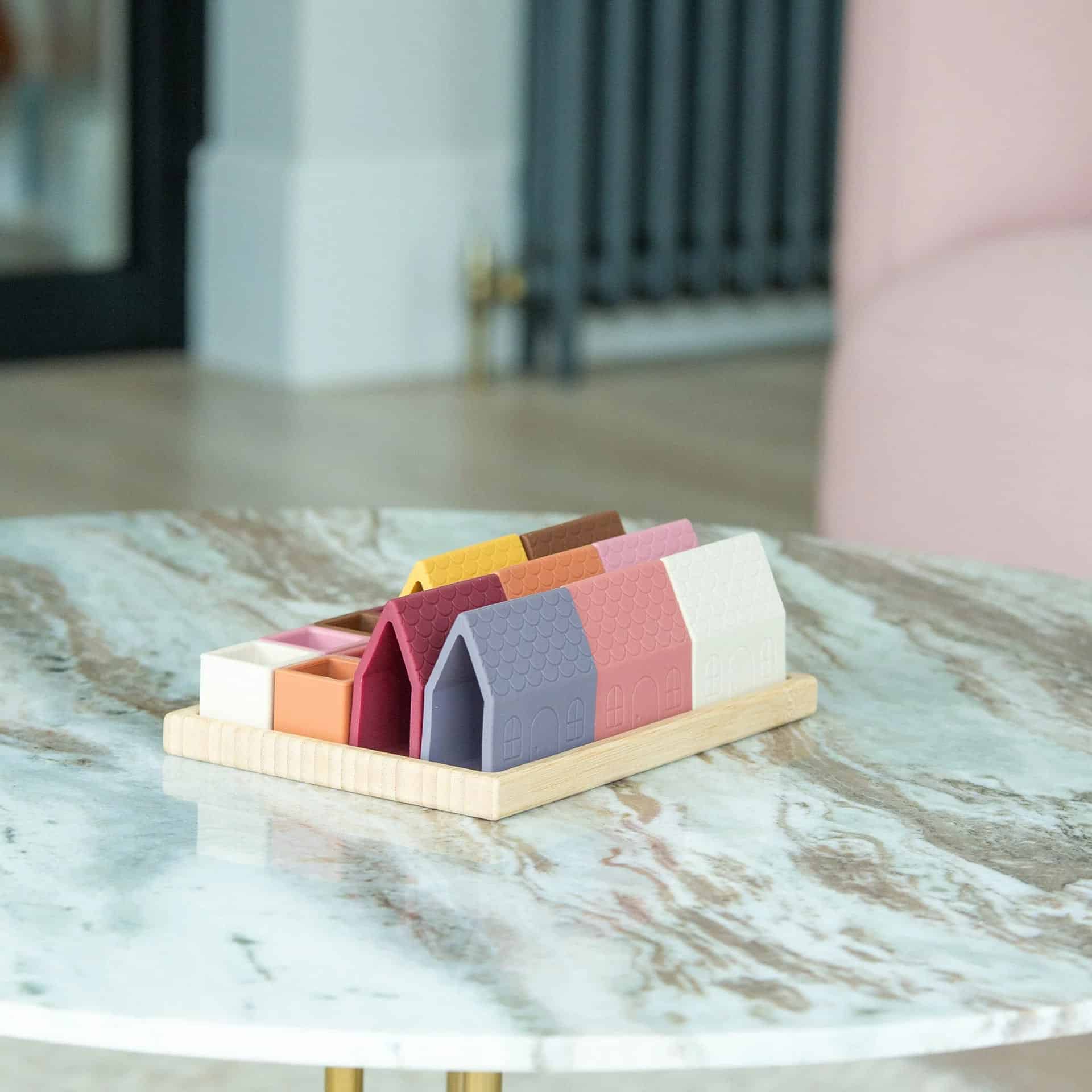 16 liebevoll gestaltete SiliSoft® Dorfblöcke (Häuser & Würfel) in sanften Erdtönen, geliefert in stabilem Bambustray. Fördert Feinmotorik, Gleichgewicht & Fantasie – geeignet ab Geburt