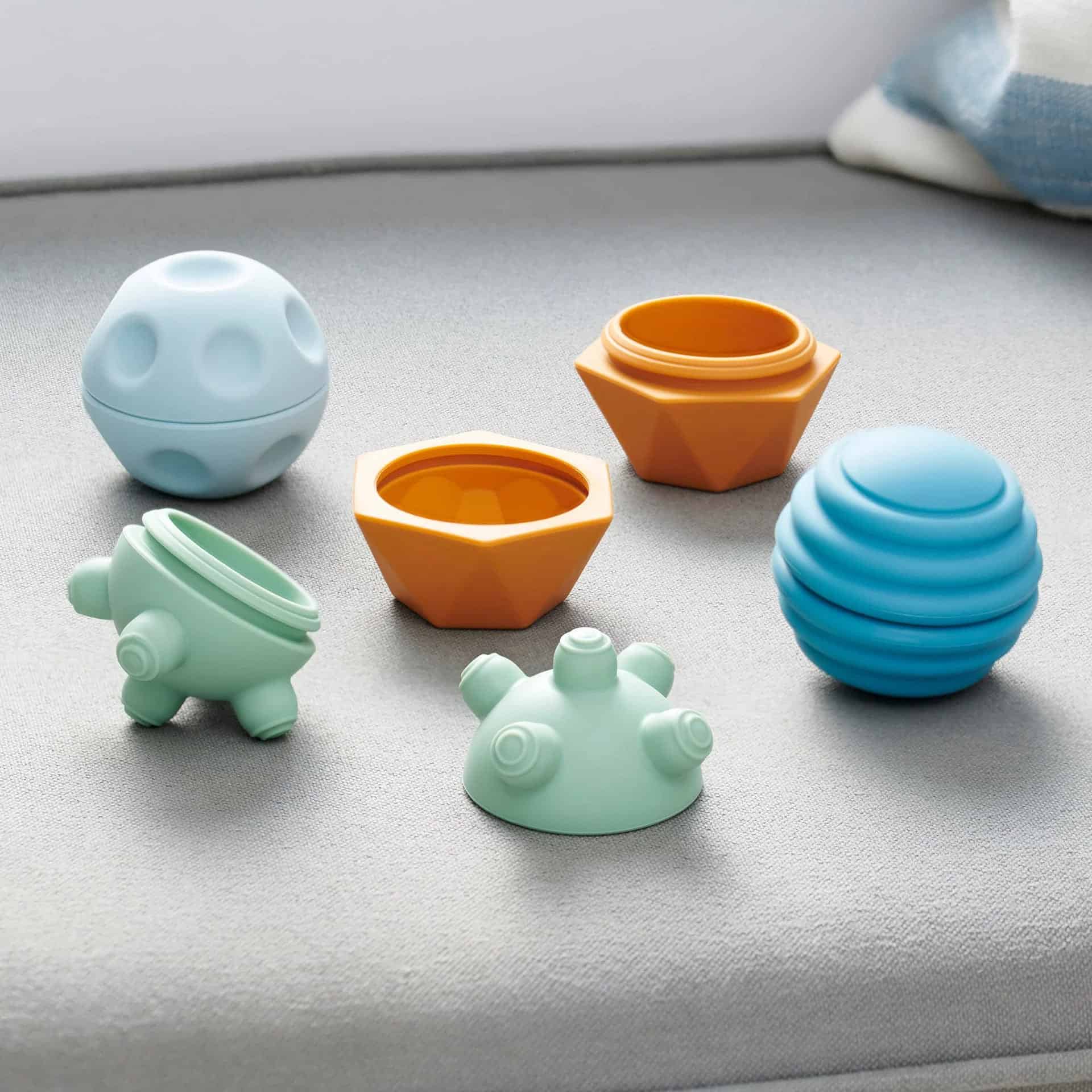 Vier weiche Silikon‑Bälle mit unterschiedlichen Texturen, Noppen und Dreh‑zum‑Öffnen‑Mechanismus. Zum Befüllen für natürliche Rassel‑Sounds. Ideal als Fidget‑Toy und für sensorische Erkundung ab 12 Monaten.