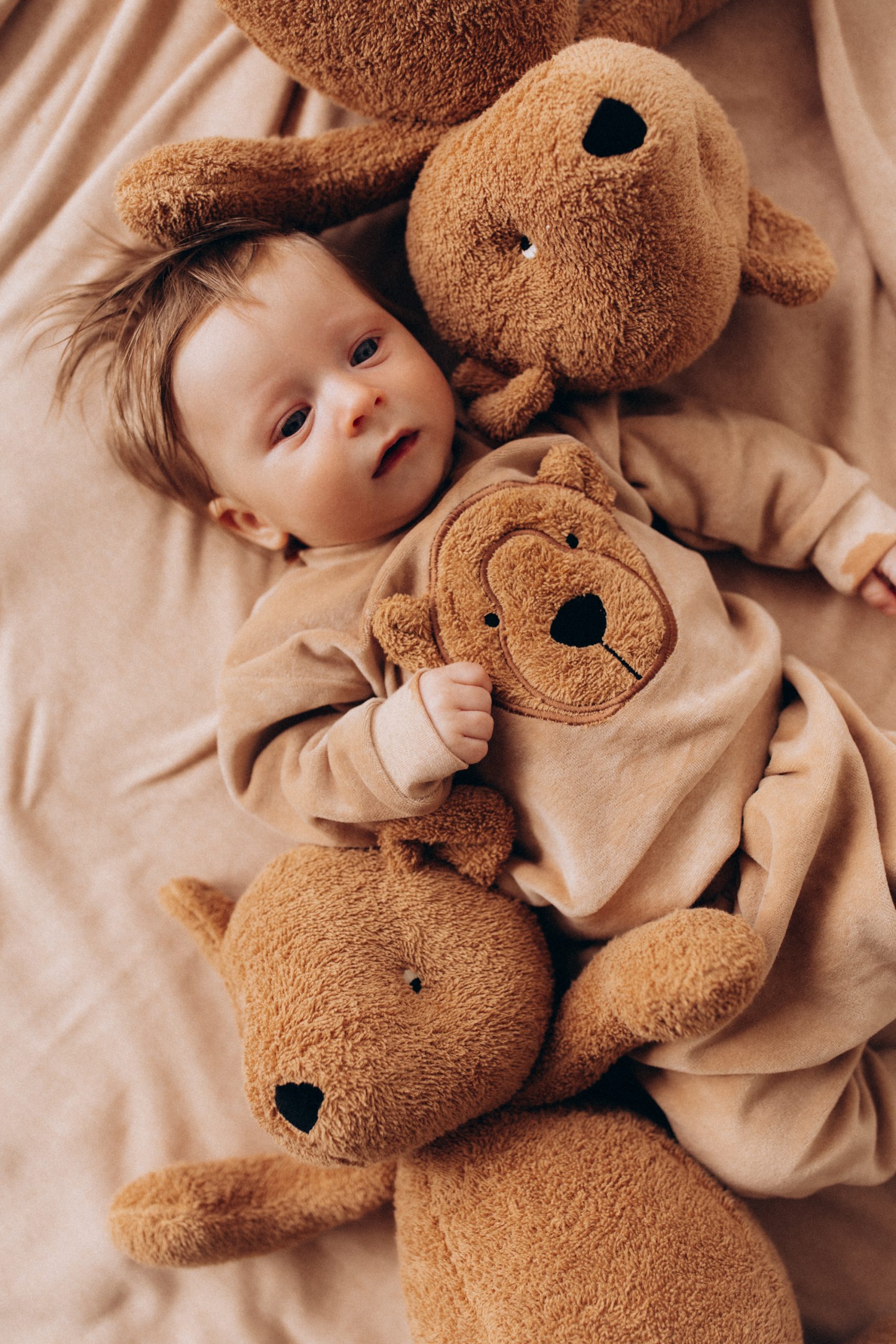 - Stofftiere & Teddys – klassische Teddybären in Varianten (mit Kragen, mit Tutu, puristischer Look) – weich, anschmiegsam, zeitlos.