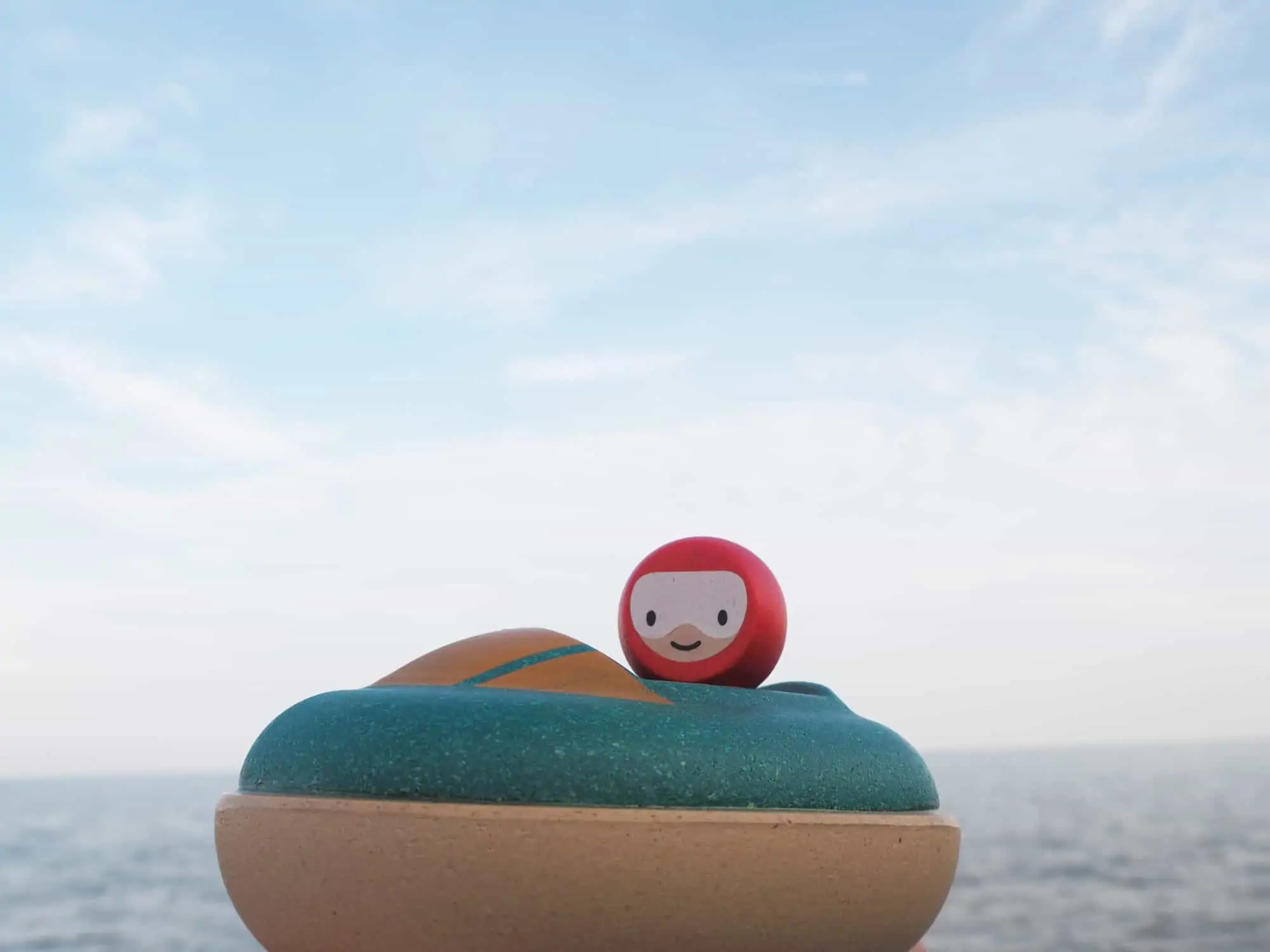 Badespielzeug in Form eines Schnellboots. Inklusive entnehmbarer Pilotenfigur. Nachhaltig produziert aus 100% Recycling-Sägemehl.