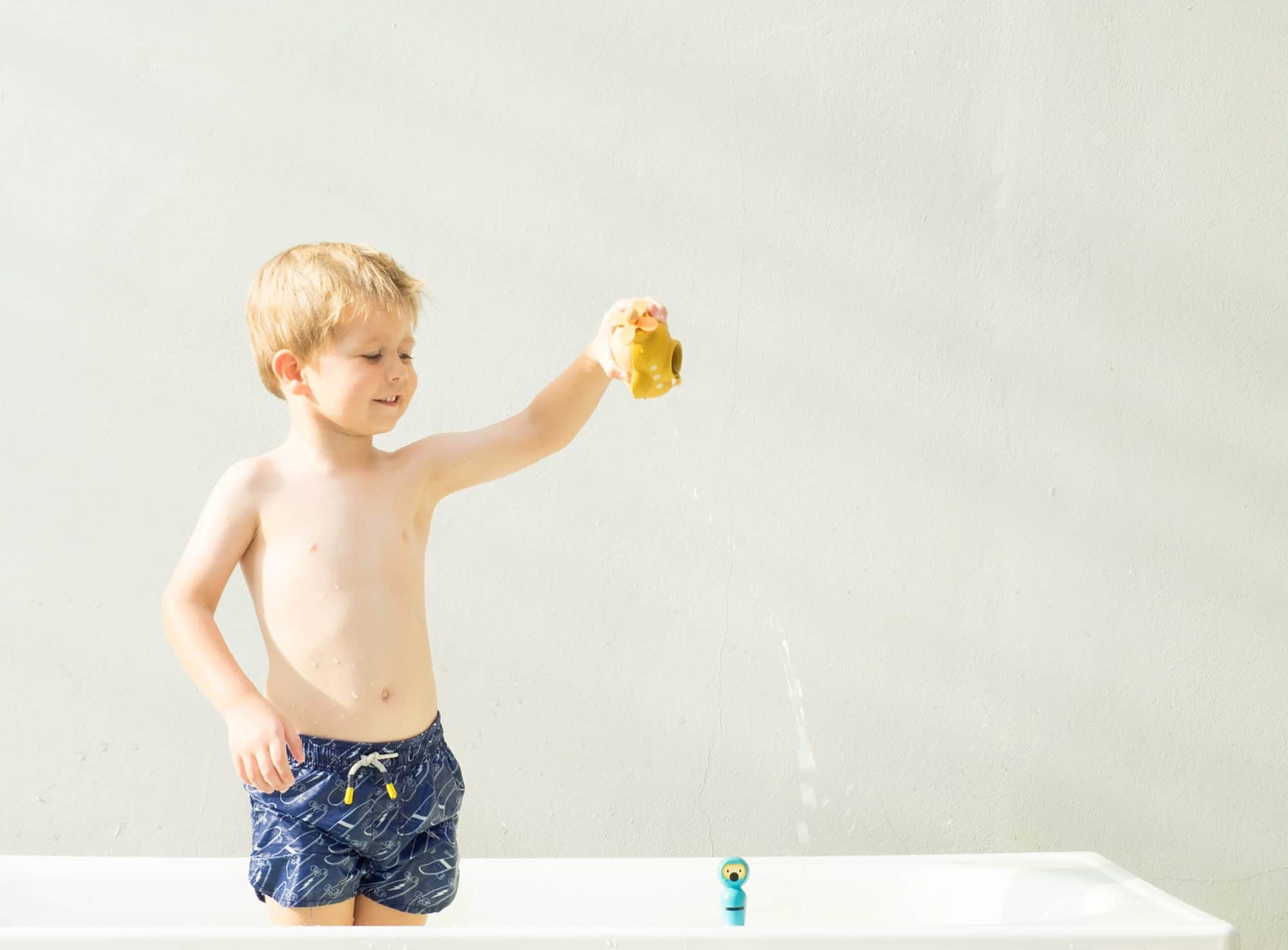 Badespielzeug in Form eines U-Bootes mit Schraube. Inklusive entnehmbarer Pilotenfigur. Nachhaltig produziert aus 100% Recycling-Sägemehl.