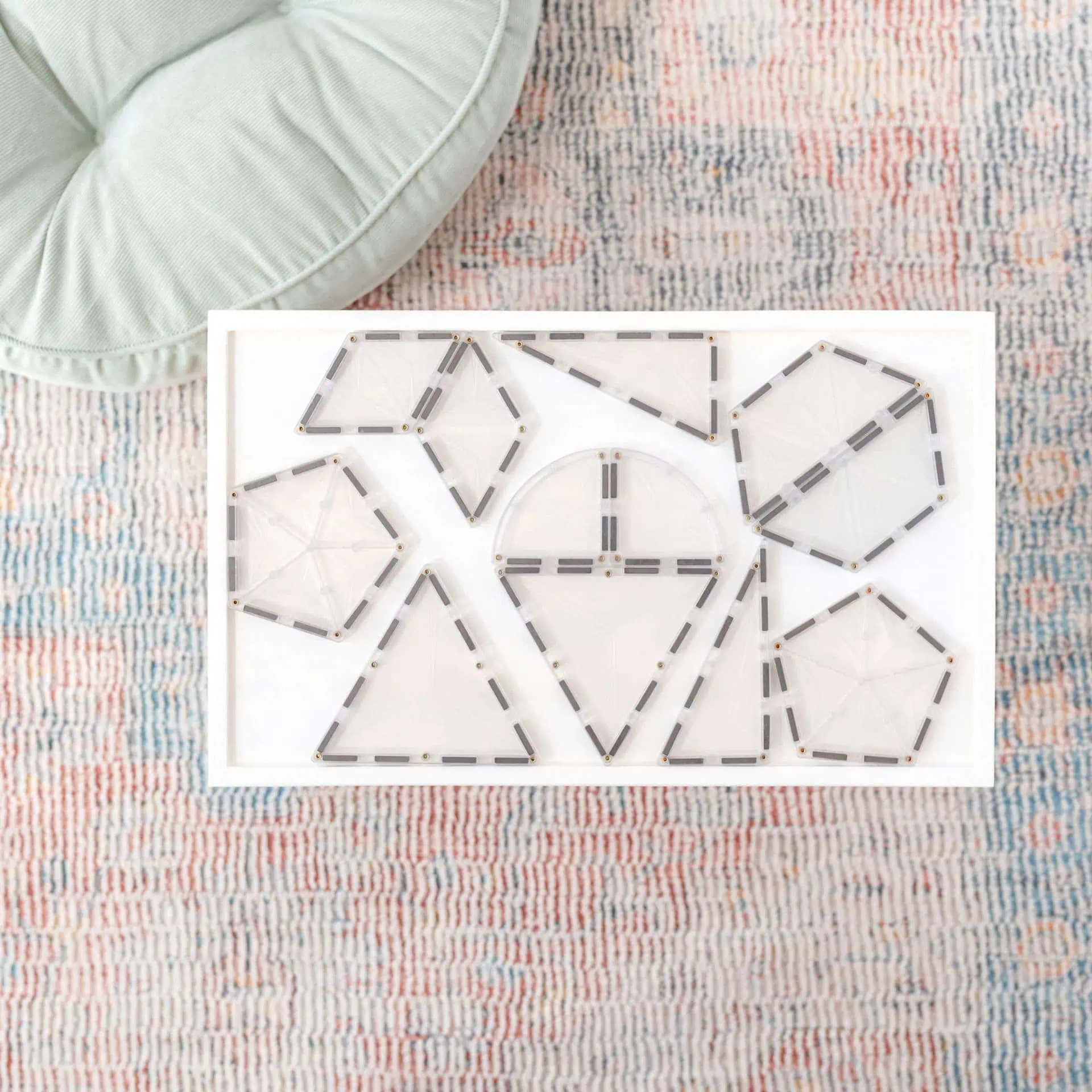 Das Connetix 24 Piece Clear Shape Expansion Pack bietet vielfältige magnetische Fliesenformen für kreatives STEAM-Lernen durch Spiel.