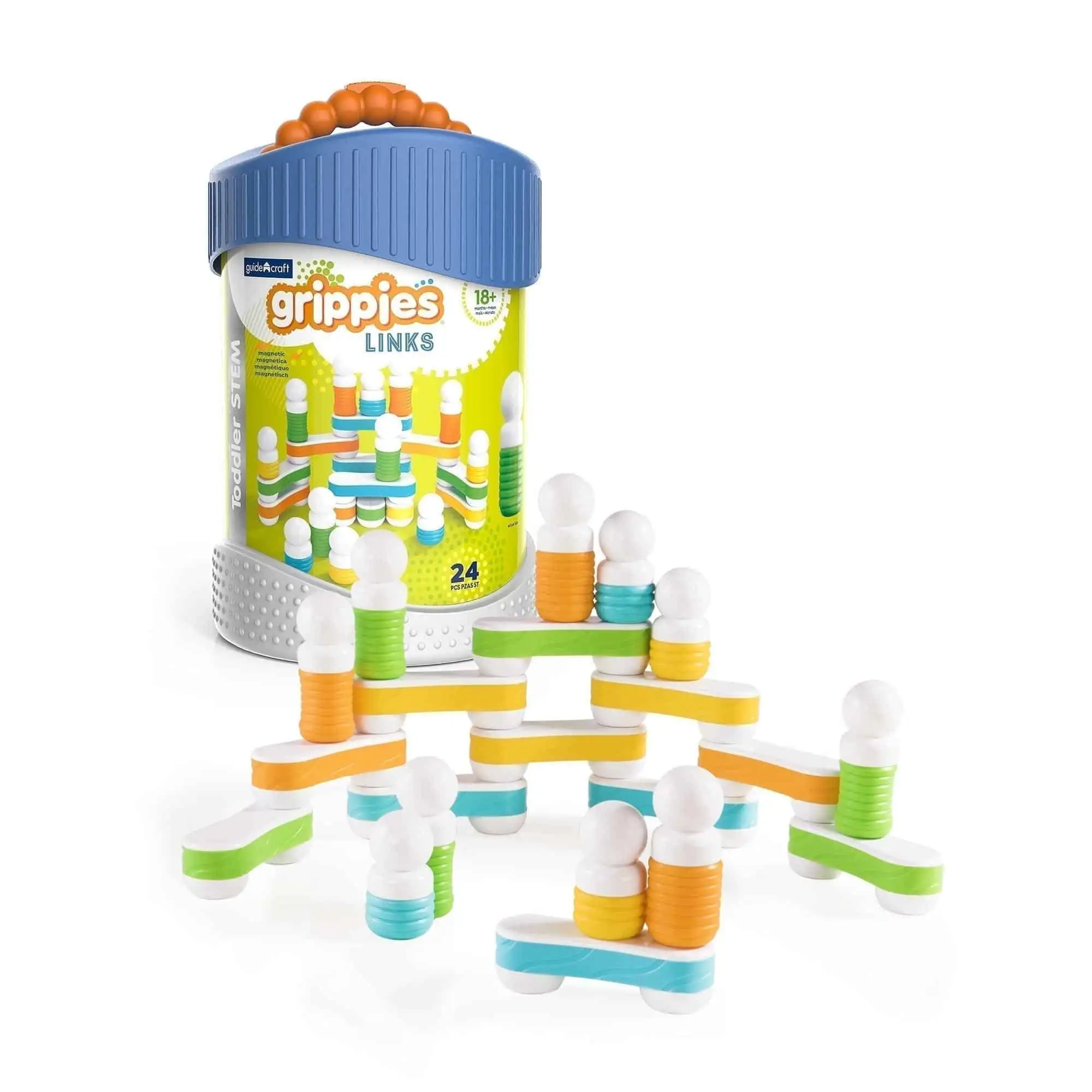 Magnetisch bauen & verbinden: 16/24 Teile mit Soft-Touch-Texturen + magnetische Figuren in 2 Größen – stapeln, verbinden, schwenken; abwischbar. Kompatibel mit Grippies Builders. Ab 18+ Mon.
