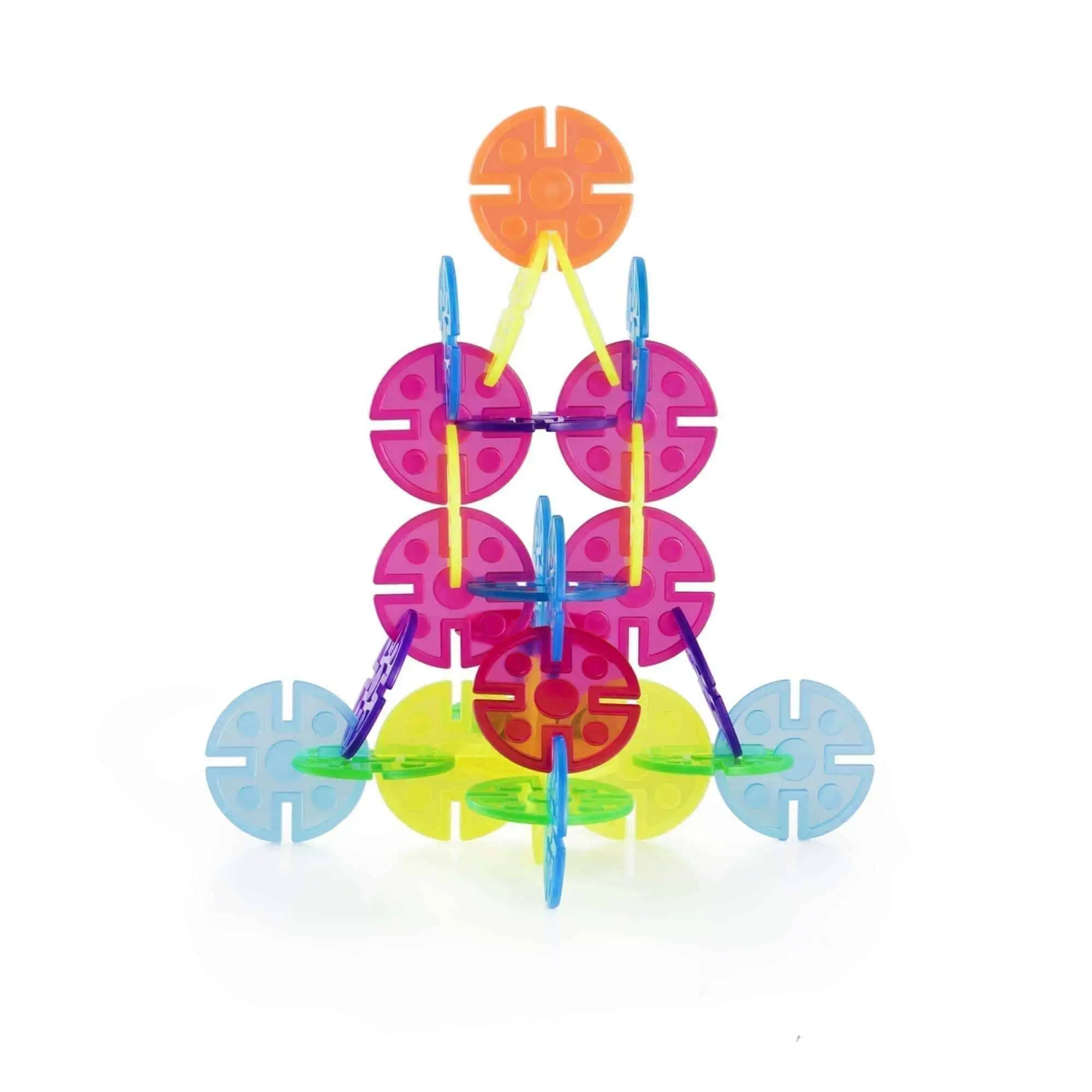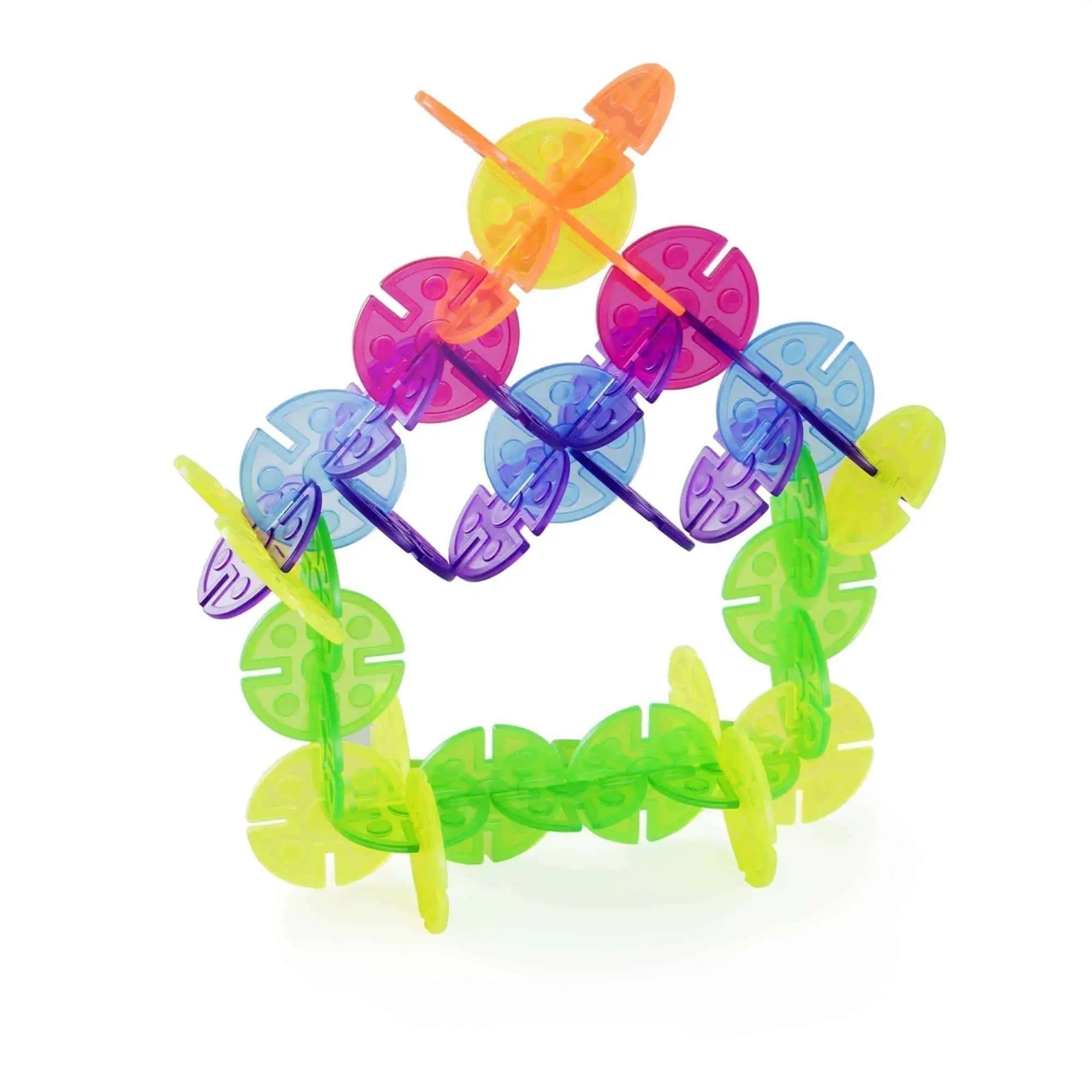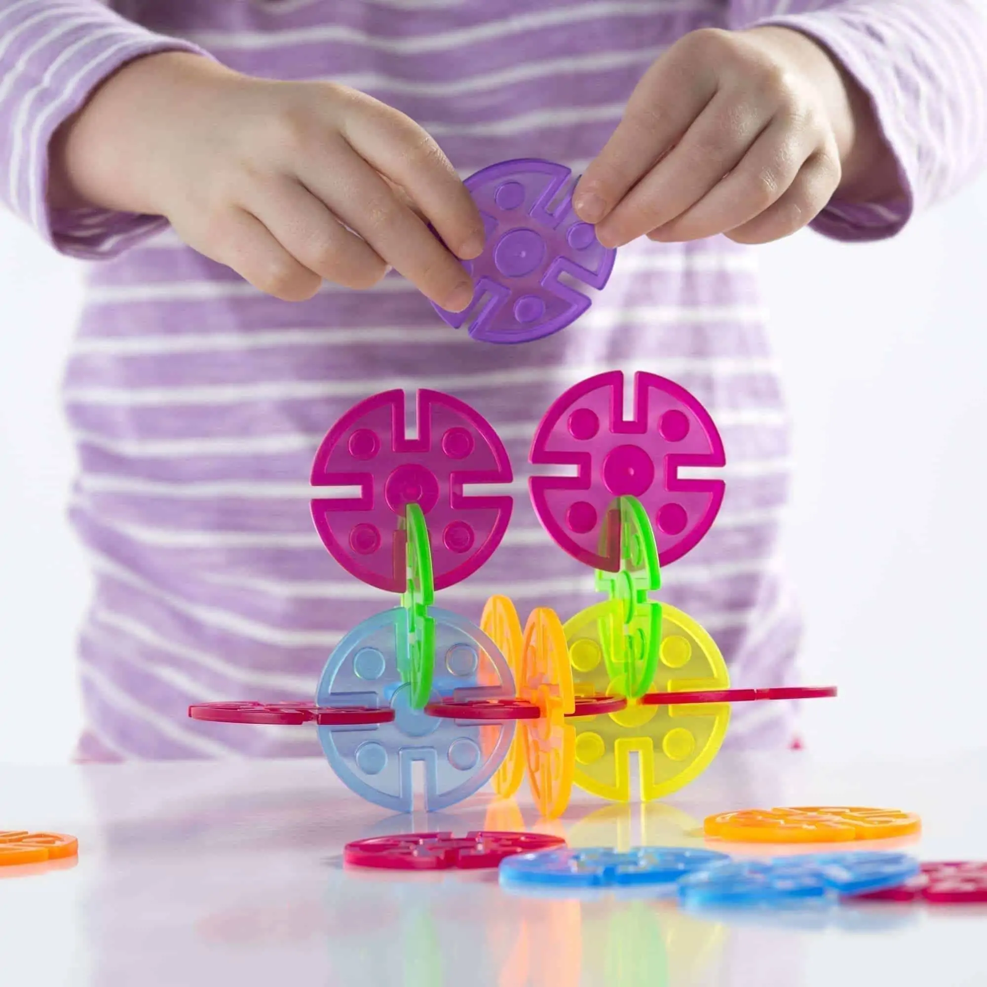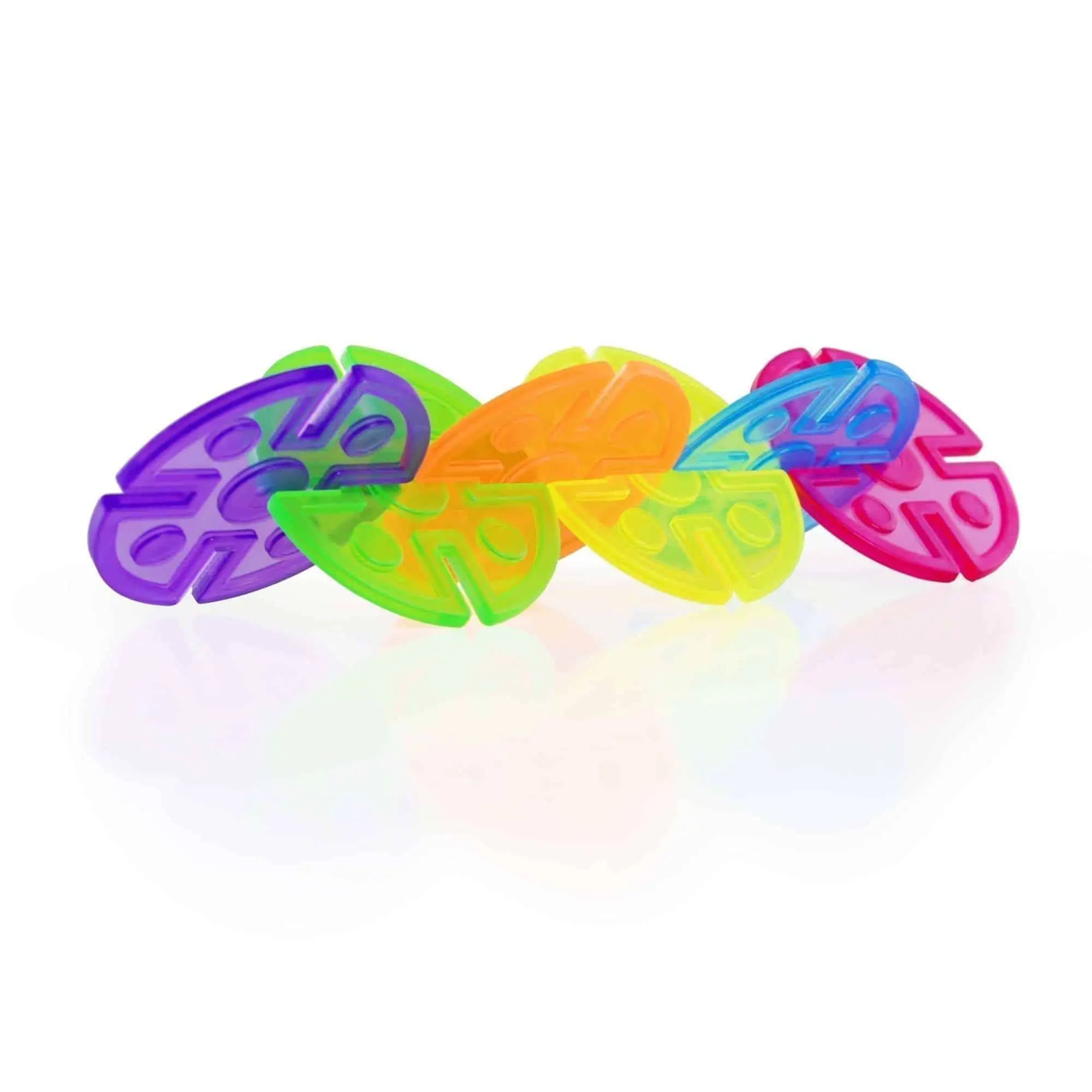 Offenes Bauen mit Licht & Farbe: 96 transparente Steck-Scheiben in 5 Farben, Kerb-Rand für sicheren Halt, geprägte Geometrien – Lichttisch-tauglich und Interlox-kompatibel. Ab 2+.
