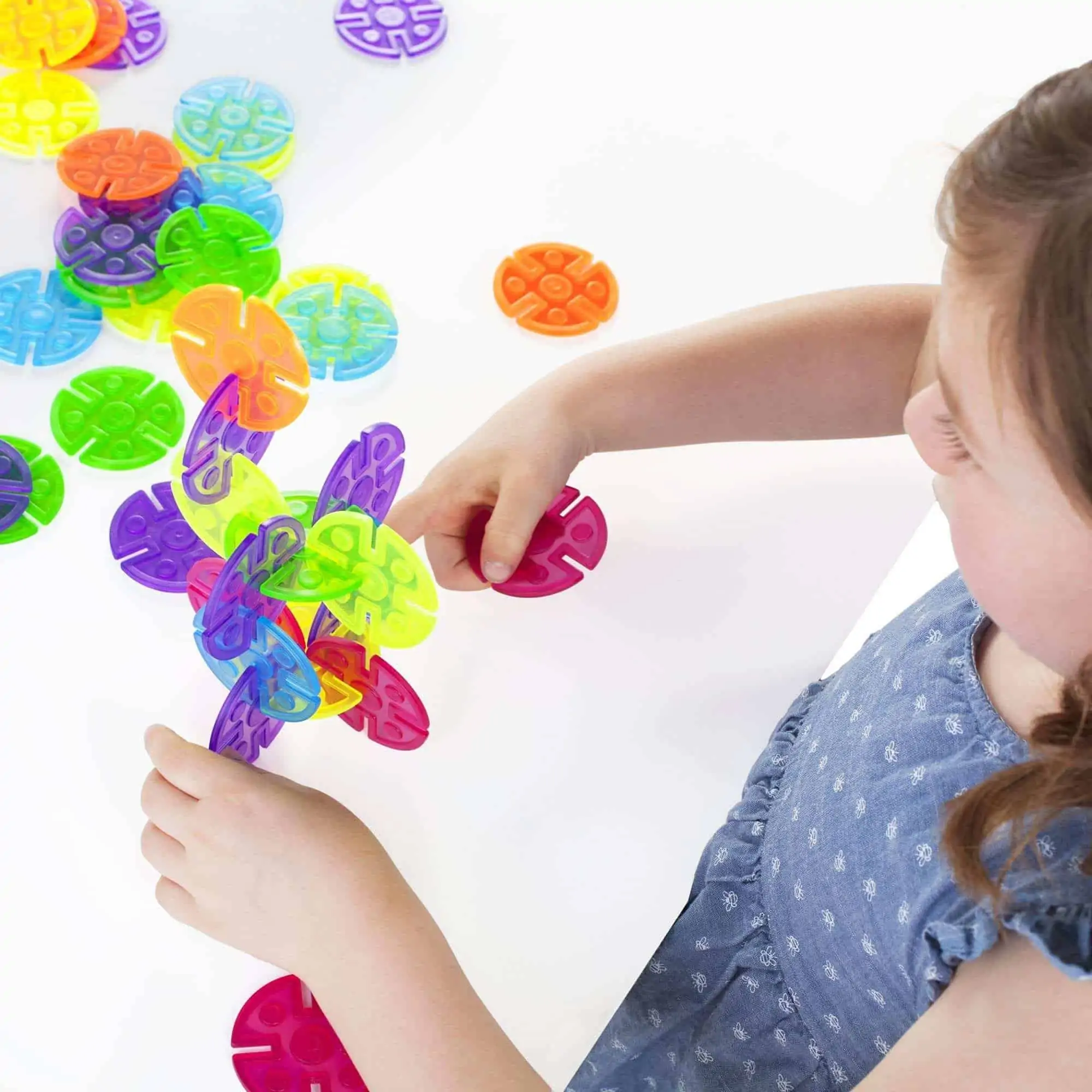 Durch das transluzente Material und die geprägten Formen entstehen auf dem Lichttisch eindrucksvolle Farbüberlagerungen, Schattierungen und Symmetrien. Kinder experimentieren mit Stabilität (wie viele Verbindungen halten eine Form?), Balance und Musterbildung – ideal für Kita, Vorschule, Forscher-Atelier oder Zuhause.