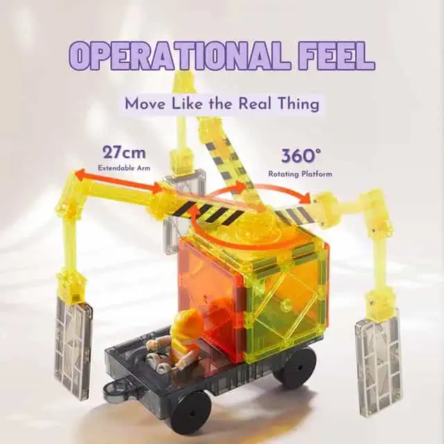 Das Set vereint magnetische Bauteile mit Kran, Fahrgestellen & Figuren für freie Builds und Rollenspiel.