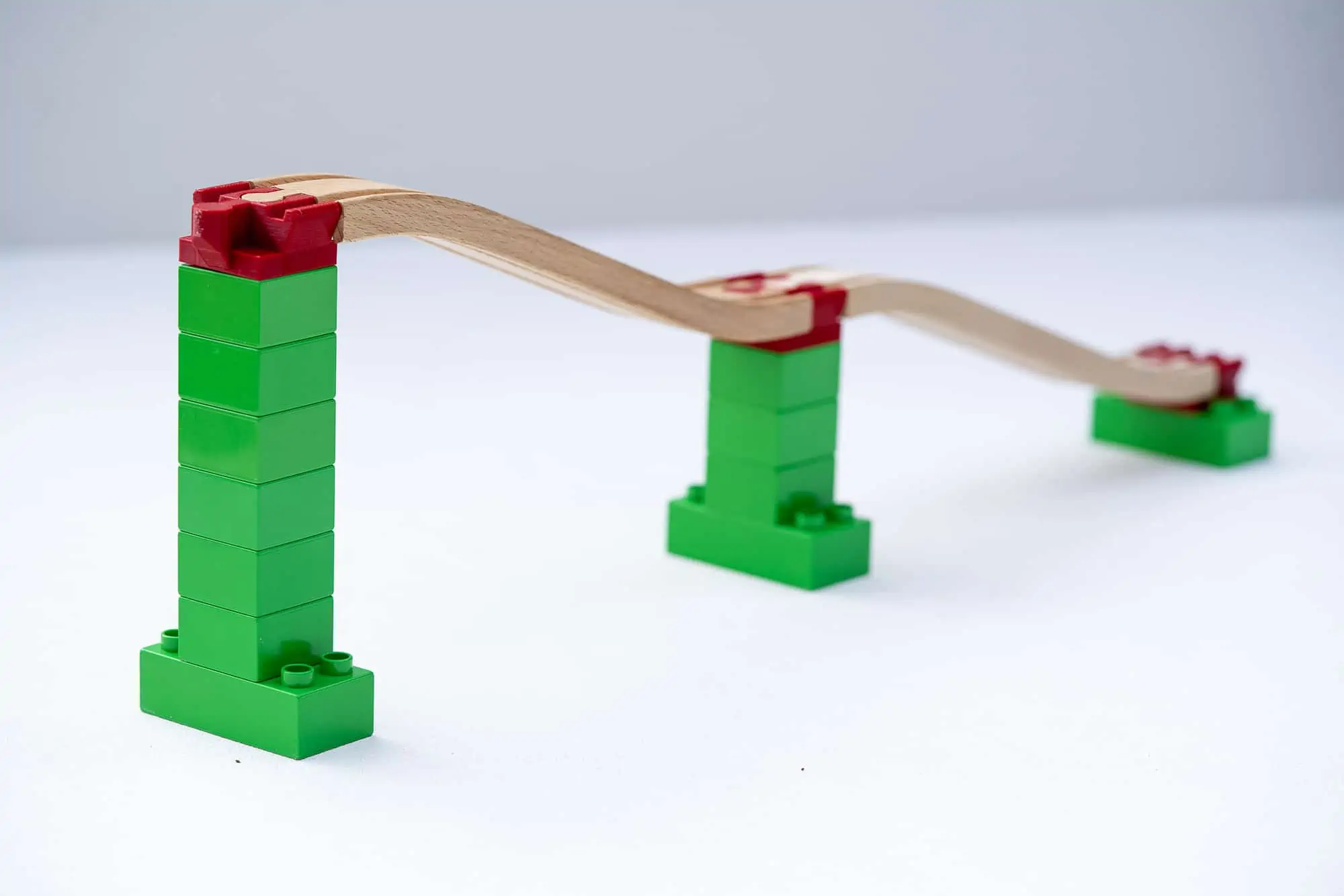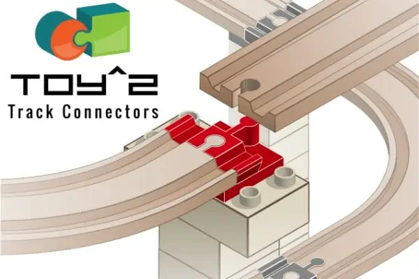 Bauspielzeug zum Verbinden von Holzschienen mit Bausteinen. Kompatibel mit Schienen von IKEA, Brio, Viga und mehr. Kompatibel mit Bausteinen von Duplo, BioBUDDi o.ä.