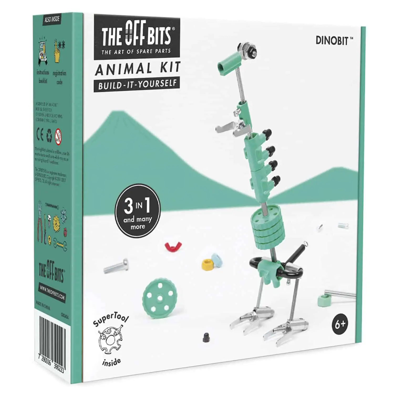 Mit der Anleitung durch das illustrierte Handbuch und dem 5-in-1 Werkzeug „SuperTool™“ verwandelst du einen bunten Haufen Muttern, Schrauben und Bolzen in einen wilden, tierischen Freund. Dann geh noch einen Schritt weiter, nimm den Dino auseinander und baue zwei weitere Kreationen, den Baby DinoBit und den MuleBit.