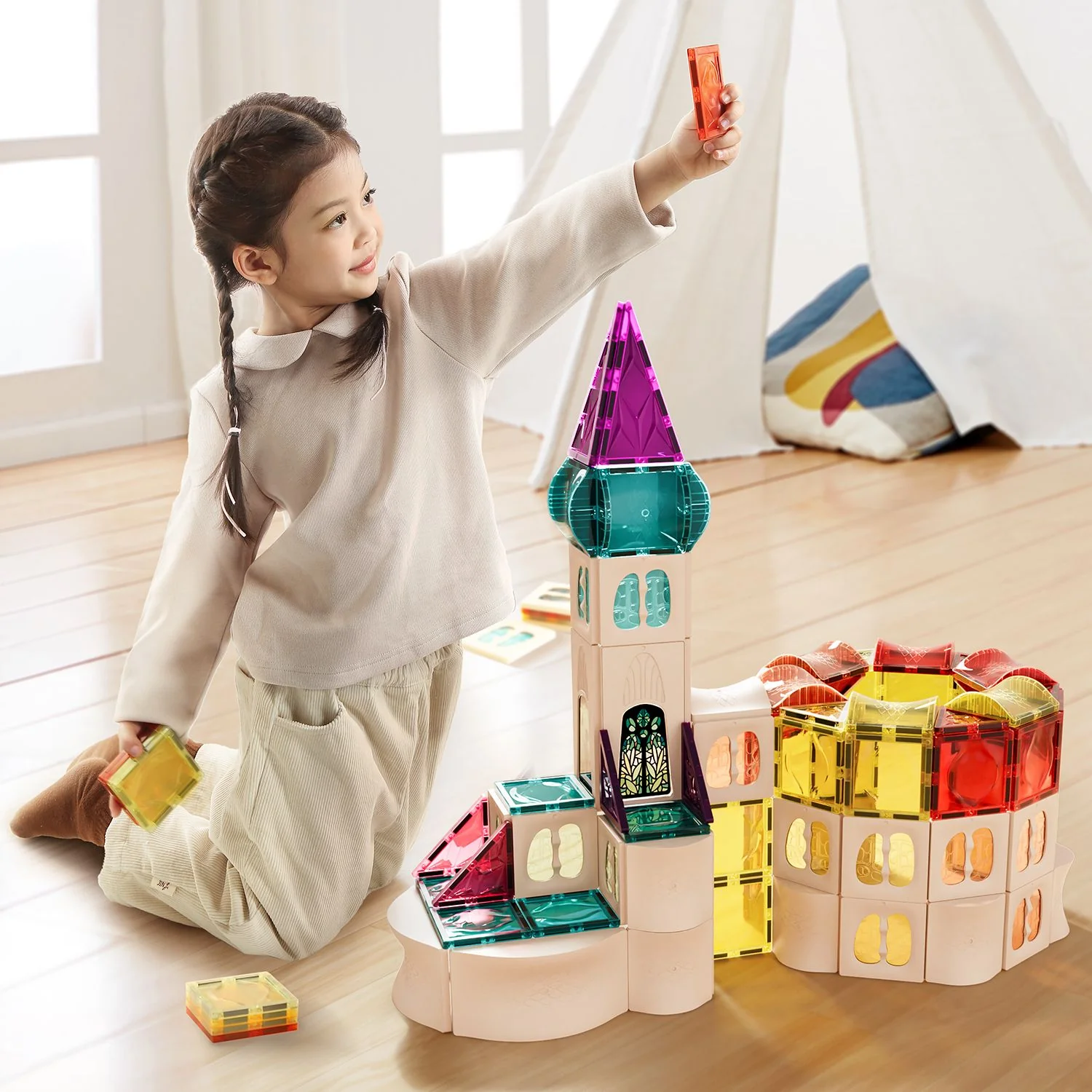 Mit MagArt 64 entstehen vom Mosaik bis zum hohen 3D-Turm immer neue Bauwerke. Die transparenten Tiles erzeugen Farb- und Schatteneffekte; einzelne Elemente im „stained-glass“-Look setzen besondere Akzente.