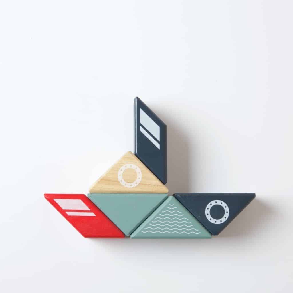 Das Set „Tugboat“ besteht aus sechs Teilen und gleicht einem Boot, aber nur solange, bis man es in über 49 verschiedene Gestalten umbaut. Die Teile können mit allen anderen tegu Blöcken kombiniert werden.