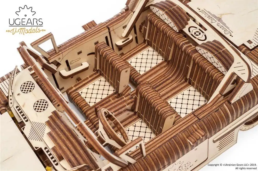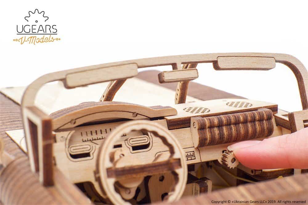 Um das Design dieses einzigartigen Modells noch realistischer zu gestalten, haben die Ingenieure von Ugears ein paar wichtige Elemente hinzugefügt, die dem Automobil ein außerordentlich lebensechtes Aussehen verleihen. Wir sind sicher, dass Ihnen die Fensterkurbeln und die funktionierenden Scheibenwischer ebenso gefallen werden wie der unter dem Kofferraum montierte Wagenheber und Werkzeugkasten.