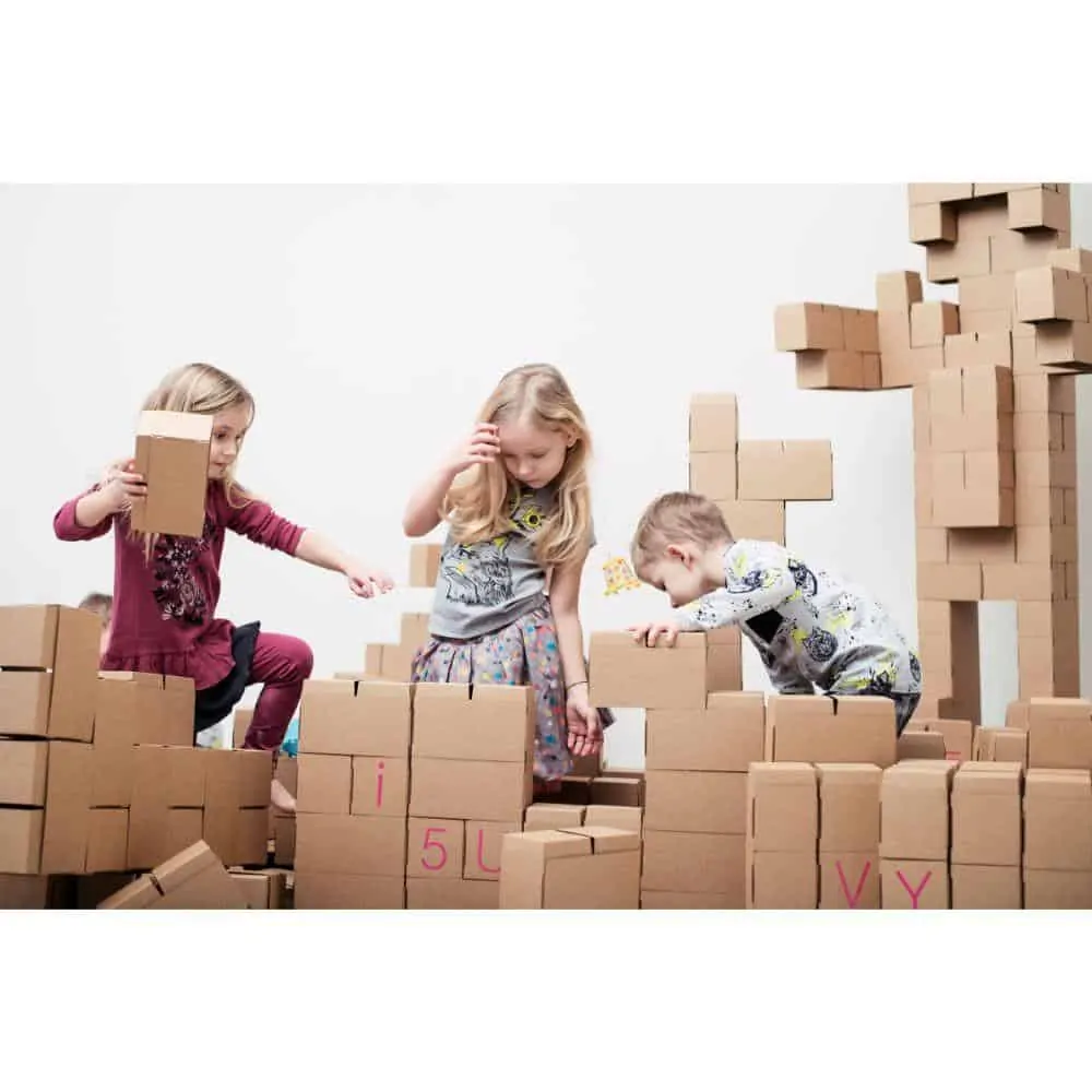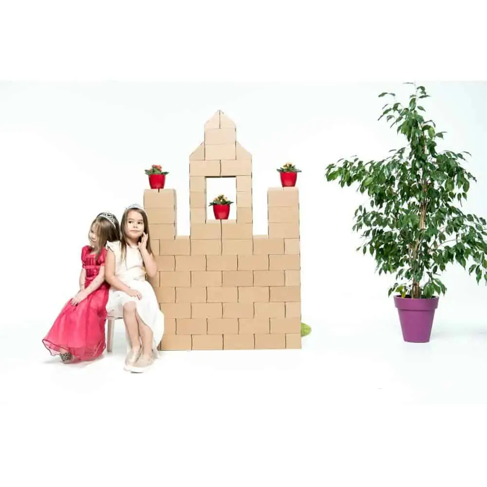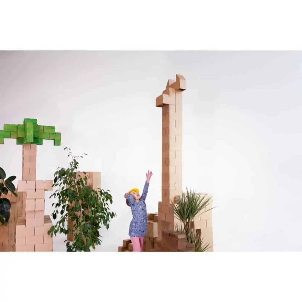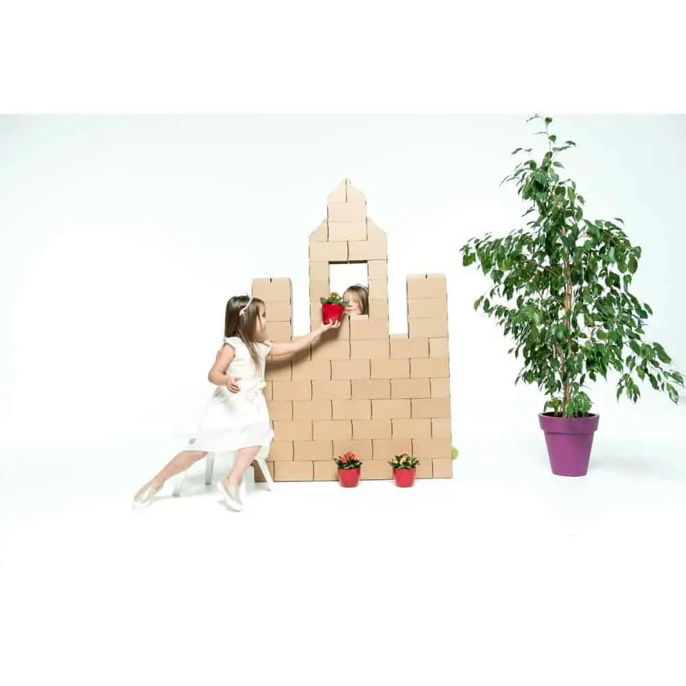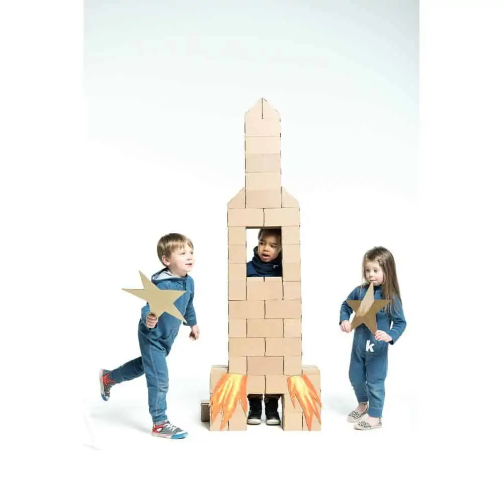 Gigi Bloks lösen dieses Problem, denn sie sind Bausteine in Übergröße mit bis zu 20 cm Länge und 10 cm Höhe und Breite. Damit lässt sich wirklich alles bauen, was man sich vorstellen kann. Die Bausteine werden aus Karton gefaltet. Dadurch sind sie leicht, einfach zu transportieren und zu verwenden, aber dennoch stabil genug, dass sie eine Belastung von bis zu 27 kg aushalten können. Dadurch können Kinder darauf sitzen oder stehen und gerne auch alles umschmeißen, ohne dass die Steine beschädigt werden.