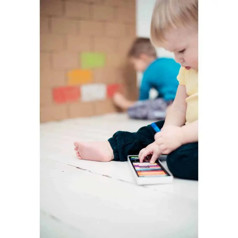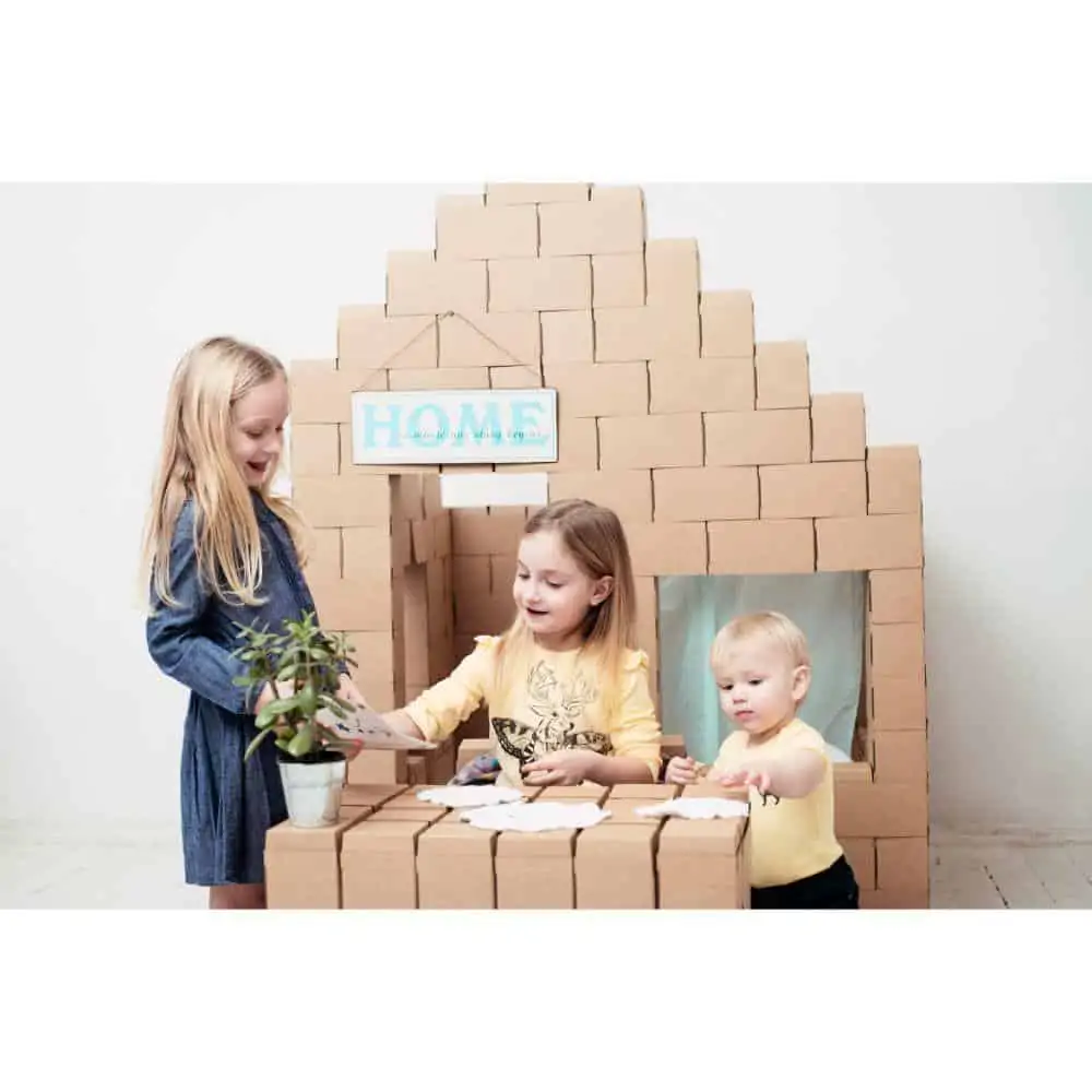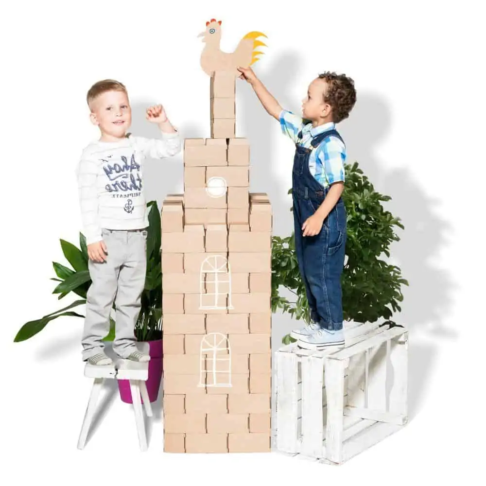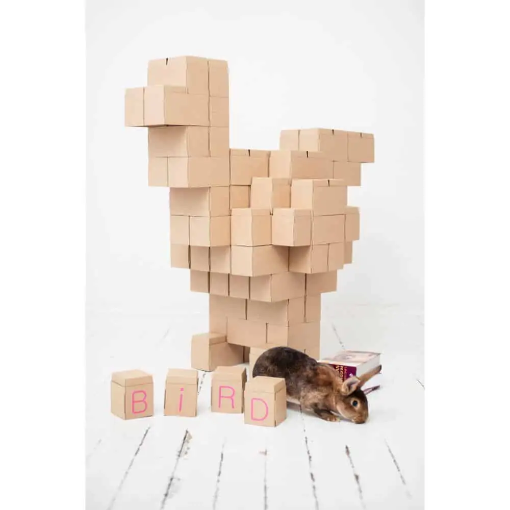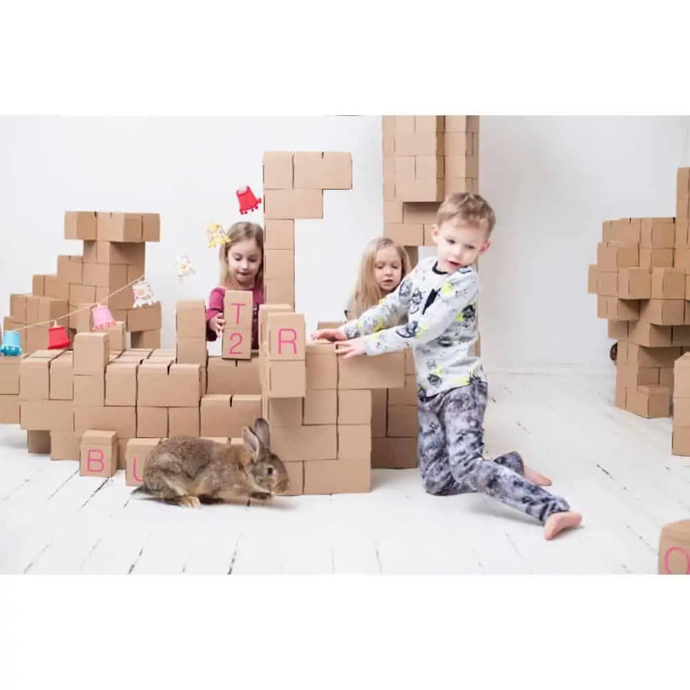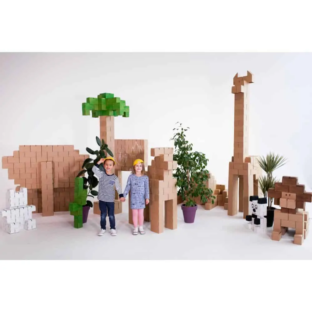 Gigi Bloks lösen dieses Problem, denn sie sind Bausteine in Übergröße mit bis zu 20 cm Länge und 10 cm Höhe und Breite. Damit lässt sich wirklich alles bauen, was man sich vorstellen kann. Die Bausteine werden aus Karton gefaltet. Dadurch sind sie leicht, einfach zu transportieren und zu verwenden, aber dennoch stabil genug, dass sie eine Belastung von bis zu 27 kg aushalten können. Dadurch können Kinder darauf sitzen oder stehen und gerne auch alles umschmeißen, ohne dass die Steine beschädigt werden.