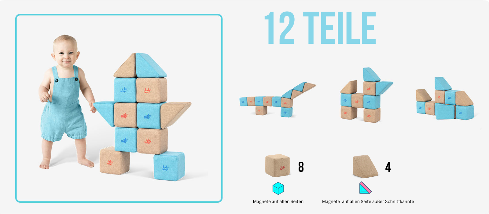 JollyHeap setzt auf langlebige Materialien, eine stabile Verarbeitung und abgerundete Kanten. Die Magnete sind zuverlässig umschlossen, die Oberflächen lassen sich einfach reinigen. Alle Produkte sind für den intensiven Alltag konzipiert; bitte die jeweiligen Altersangaben beachten.