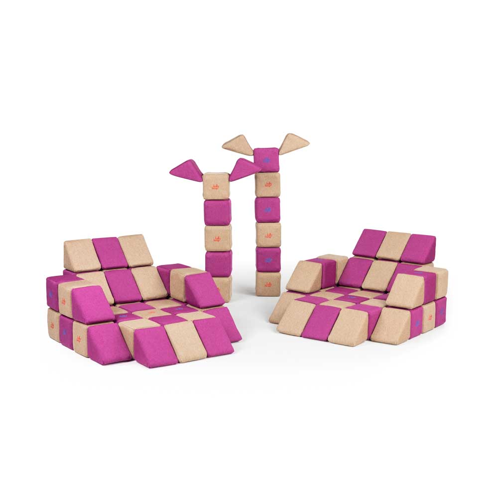 Die Blöcke sind formstabil, pflegeleicht und auf den täglichen Einsatz ausgelegt. Dank des weichen Bezugs entstehen leise Bau-Welten, die Kinder lange motivieren – von Mosaiken bis zu Podesten, Häusern und Fahrzeugideen.