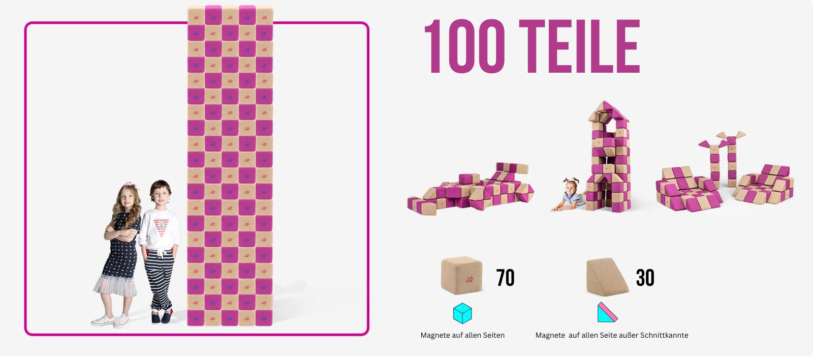 - Großformat-Magnetbausteine (weich) – weiche, leise Bausteine mit starker Magnetkraft – für großformatiges Bauen zuhause, in Kita & Schule.