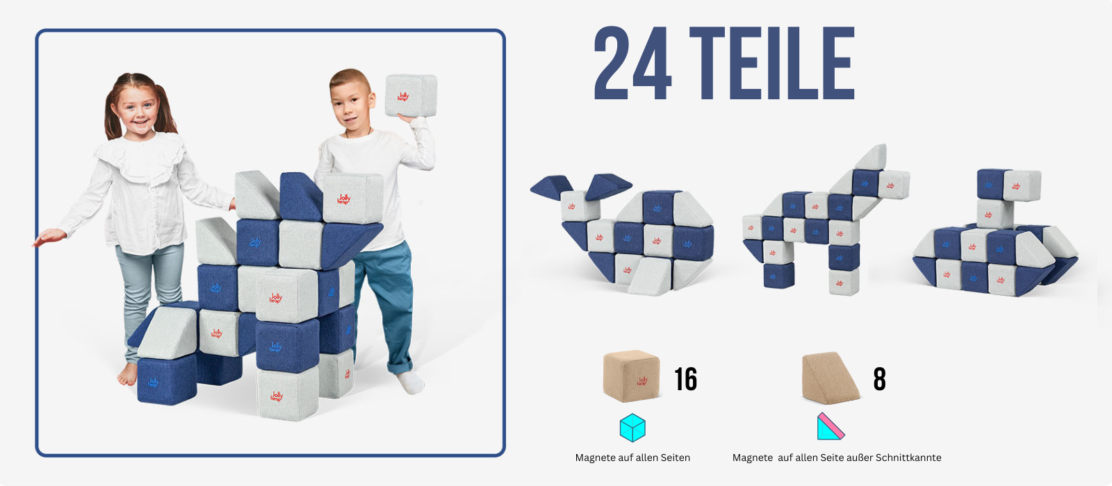 JollyHeap kombiniert weichen Schaum mit starker Magnetkraft – für stabile 2D/3D-Konstruktionen in Großformat, die leicht, leise und sicher sind. Handgefertigte Bausteine mit angenehmer Haptik laden zum Stapeln, Verbinden und Experimentieren ein – zu Hause, in Kita & Schule oder in der Therapie.