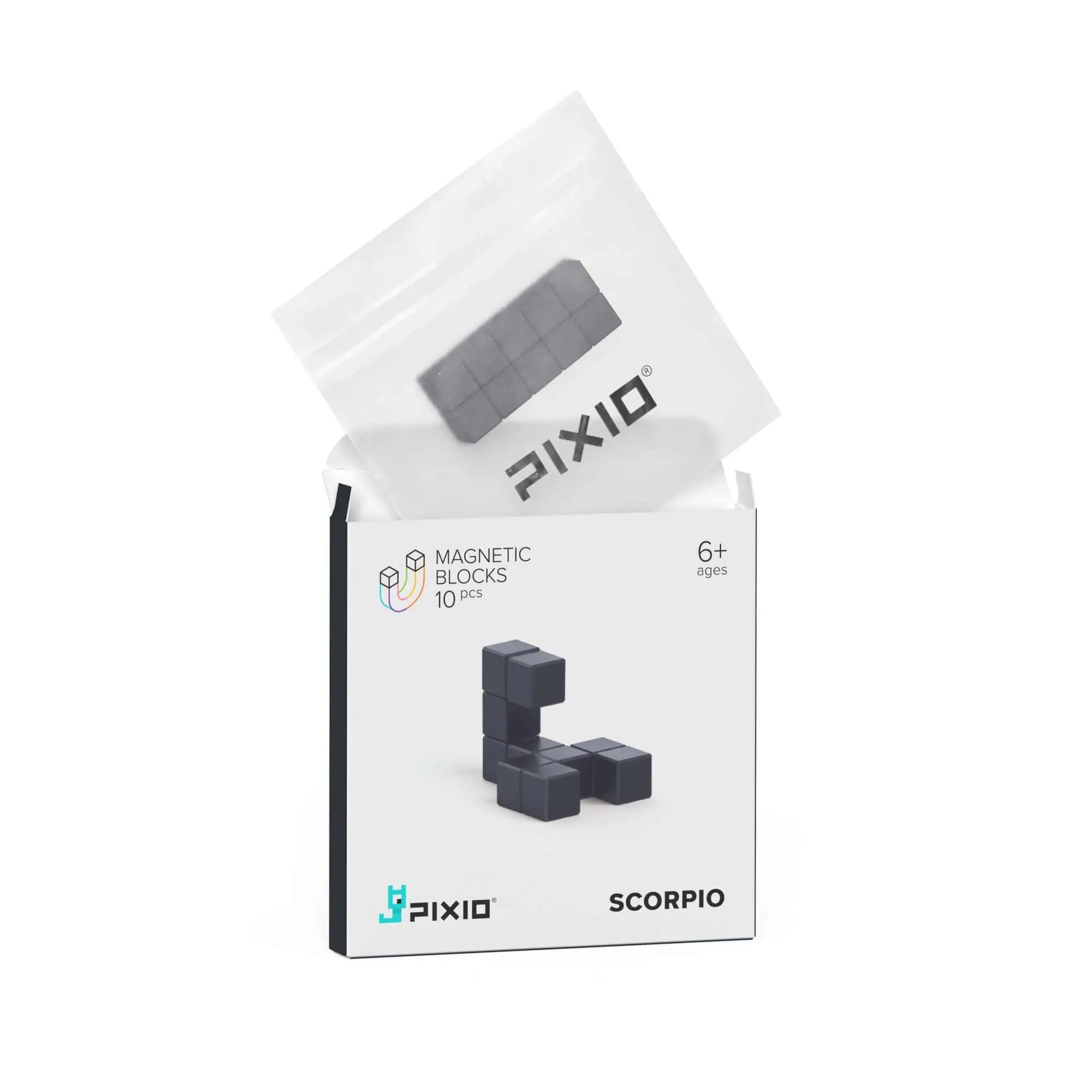 10 magnetische PIXIO-Bausteine in Schwarz – baue einen Mini-Skorpion oder andere schwarze Pixel-Figuren. Kompatibel mit allen PIXIO Sets; App-Inspirationen für Kinder & Erwachsene.