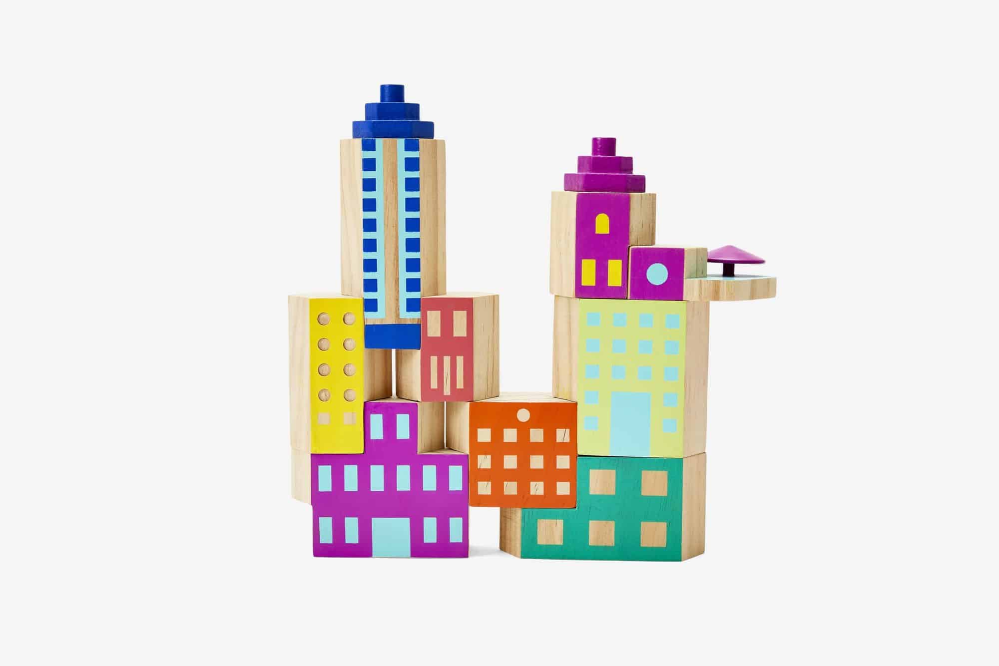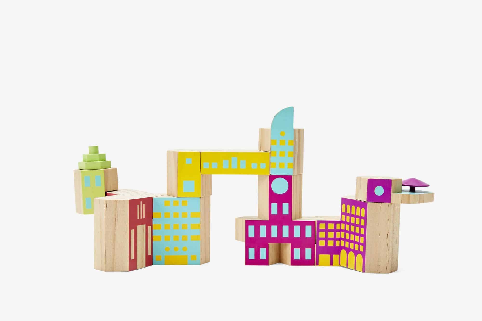 Baue die Welt nach deinen eigenen Vorstellungen mit Blockitecture, einem Set von Holzbausteinen im Stadt-Design. Die sechseckigen Blöcke können neben- und aufeinander gestapelt werden, um Türme, Häuser und Städte zu erschaffen.