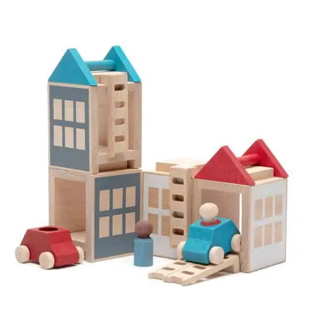 Alle Lubu Town Sets beinhalten Häuser, Dächer, Leitern, Figuren und Autos aus natürlichem Buchenholz. Sie sind CE-zertifiziert und erfüllen den europäischen Standard für Spielzeugsicherheit EN 71. Das verwendete Holz stammt aus lokalen Quellen, um Transportwege und damit verbundene negative Einflüsse auf die Umwelt so gering wie möglich zu halten.