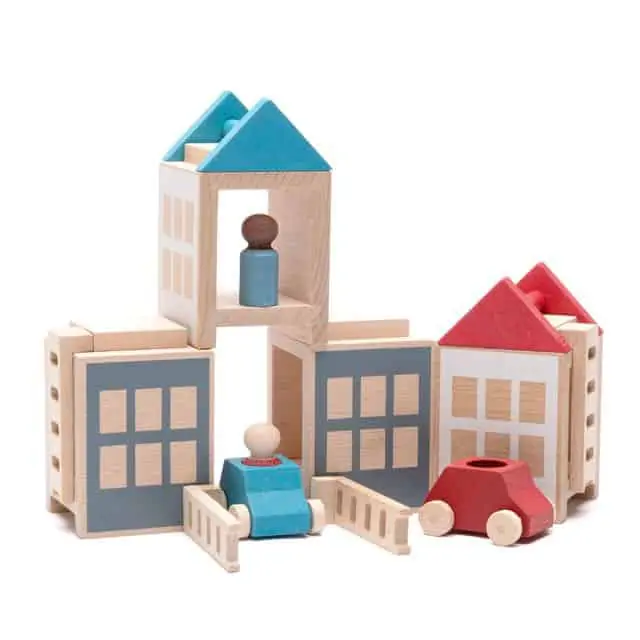 Holzbaukasten zum Erstellen von Städten und Gebäuden aus der Lubu Town Reihe. Mit Häusern, Fahrzeugen und Figuren in warmen Sommerfarben.