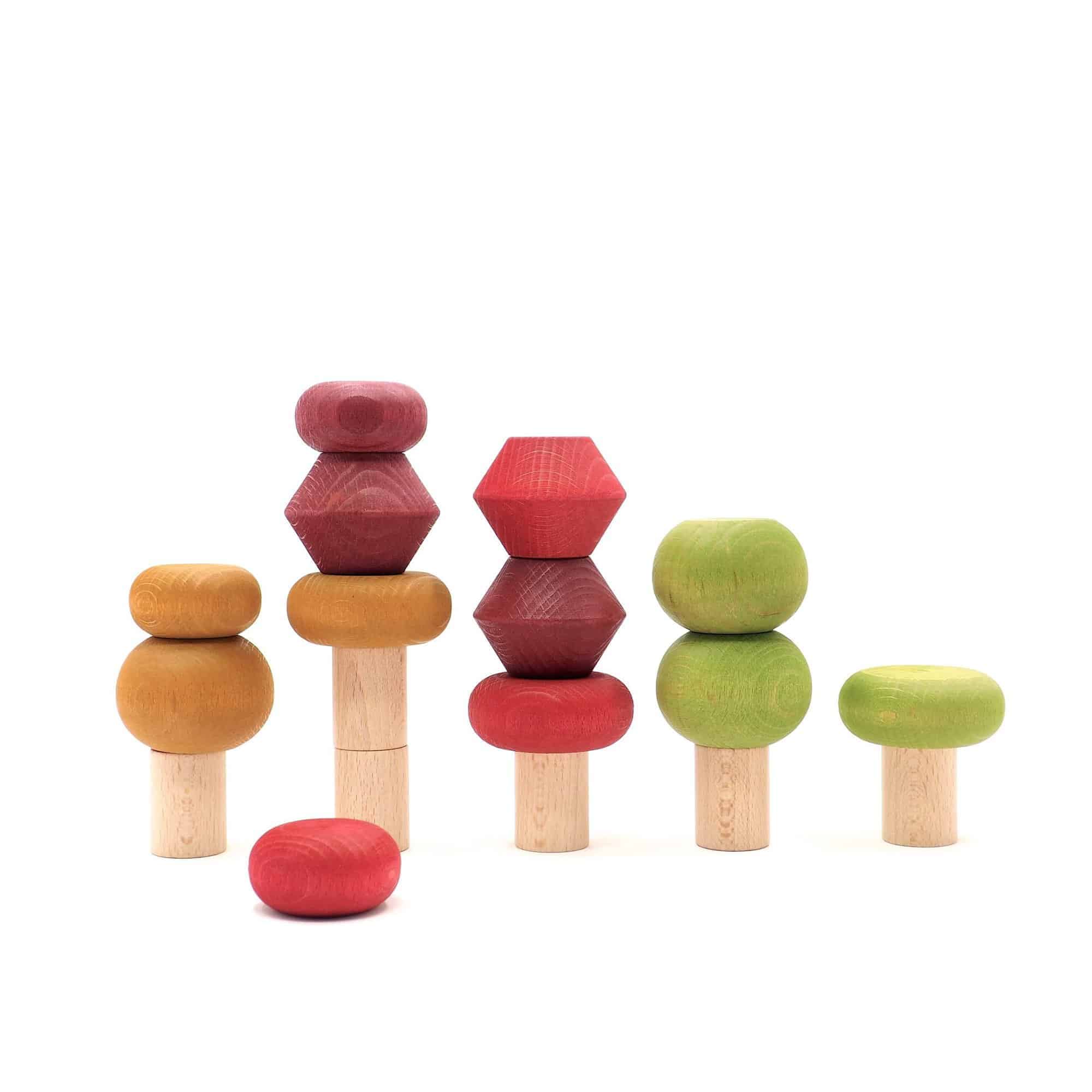 18-teiliges Stapelspielzeug aus Holz. 6 Baumstämme und 12 Baumkronen in Herbstfarben. Passt perfekt zum Lubu Town Autumnvale Set.