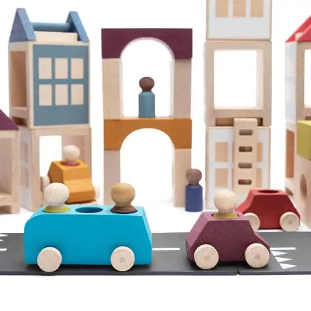 • Holzspielzeugautos und Bus: Die liebevoll gestalteten Holzautos und Busse sind perfekt auf die Stadtlandschaften abgestimmt und ergänzen jedes Spielset ideal.