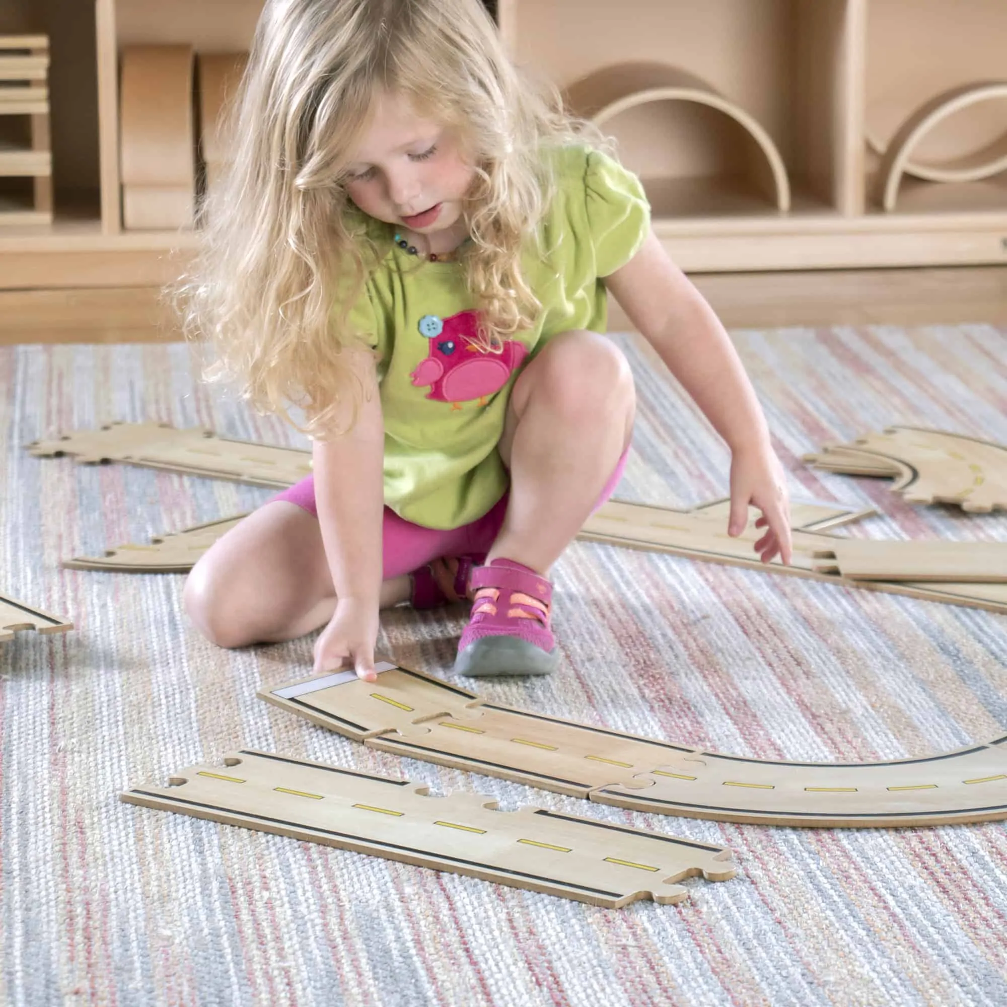 Straßen bauen & umkonfigurieren: 42 doppelseitige Puzzle-Teile aus MDF-Laminat, leicht ineinandersteckbar. Inkl. 5 doppelseitiger Inspirationskarten. Skaliert für Unit Blocks. Ab 2+.