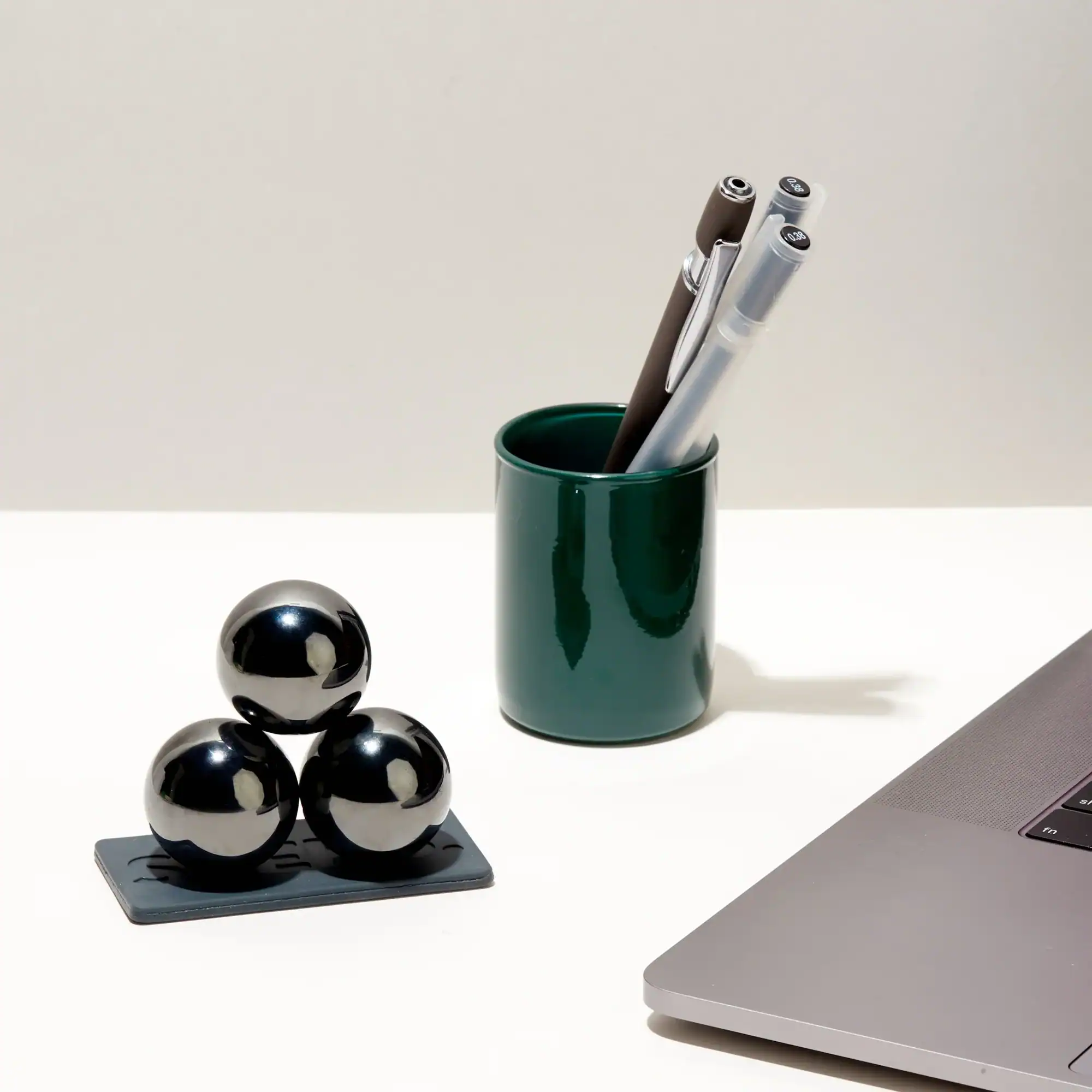 Drei Magnetkugeln Ø 33 mm in Gunmetal oder Oil Slick. Edles Desk-Toy fürs Fidgeting, Fokus & Entspannung – für Teens & Erwachsene.