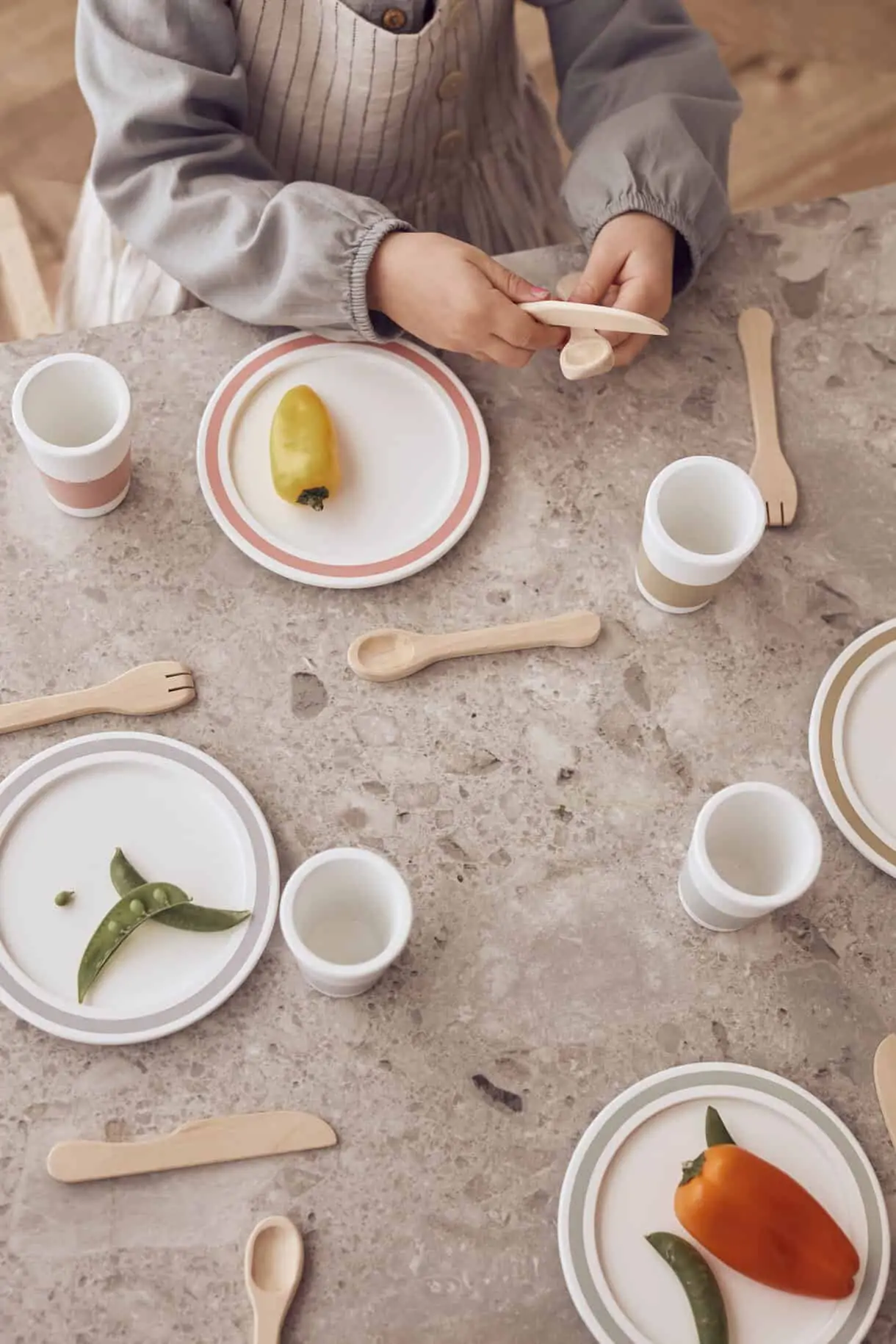 20-teiliges Rollenspiel-Set aus Holz aus der BISTRO Reihe von Kid’s Concept. Mit je 4 Tellern und Bechern in verschiedenen Farben sowie  je 4 Gabeln, Messern und Löffeln in natur.