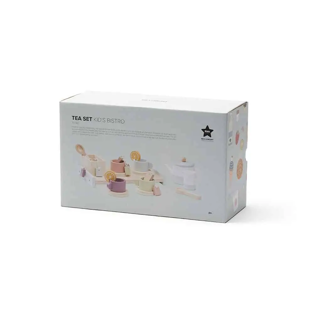 21-teiliges Rollenspiel-Set aus Holz aus der BISTRO Reihe von Kid’s Concept. 4 Teetassen mit Untertasse, zwei Zitronenscheiben, zwei Löffel, sowie Tablett, Teekanne, Milchgießer und Aufbewahrungsbox.