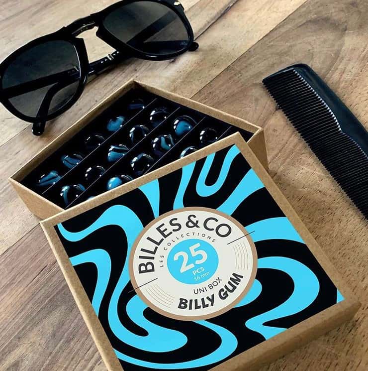 Was kann es an Murmeln schon geben, was so besonders ist. Ein paar Glaskugeln, die du rollen, schieben oder werfen kannst, das klingt nicht so wirklich weltbewegend. Aber wenn du so denkst, kennst du die Murmelsets von Billes & Co noch nicht! Die zeigen dir nämlich, dass Murmeln auch wunderschön sein können. Es müssen keine einfallslosen Glaskugeln sein, die in einem Plastiknetz präsentiert werden. Sie können verspielte Farben aufweisen, die dich zum Träumen anregen, wie die Kombination aus Schwarz und Blau in der Unibox Billy Gum.