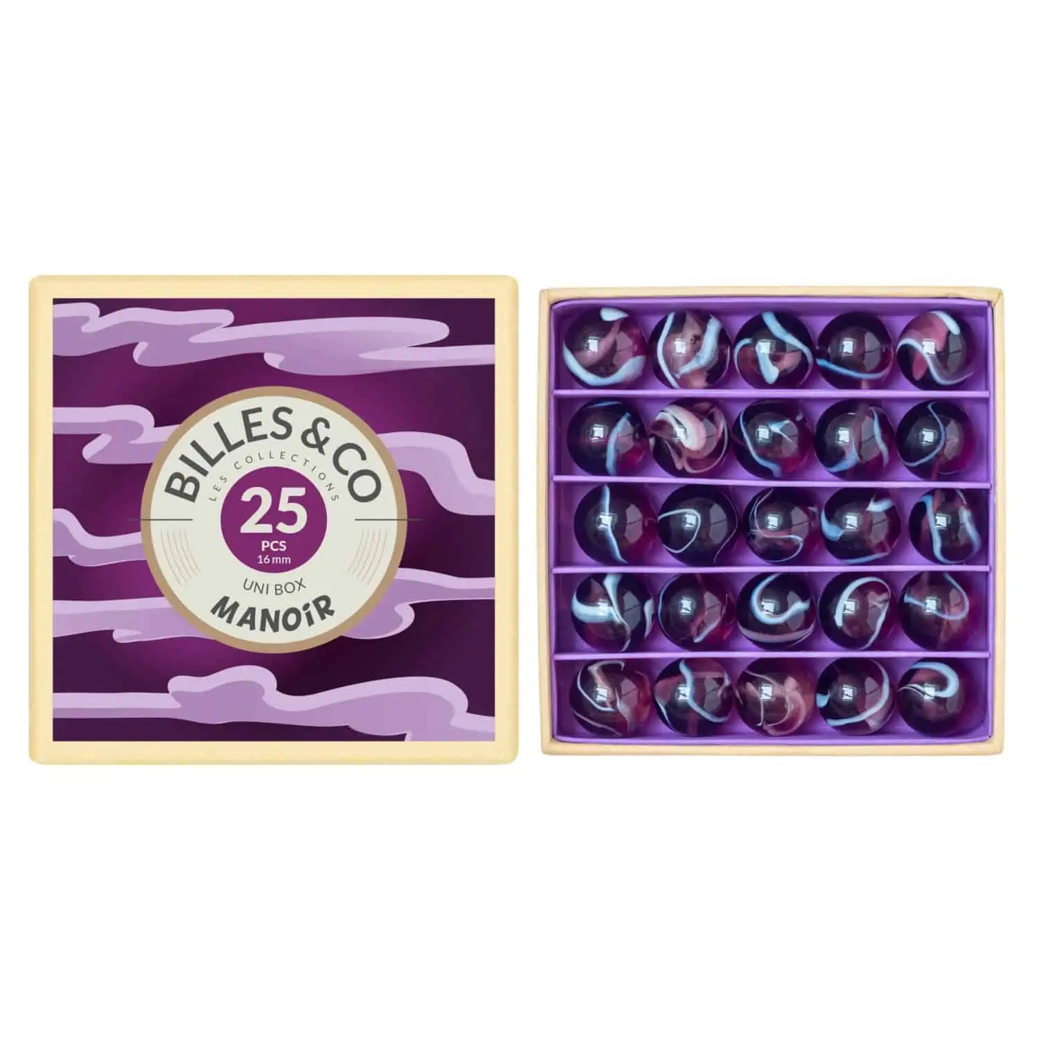 Was kann es an Murmeln schon geben, was so besonders ist. Ein paar Glaskugeln, die du rollen, schieben oder werfen kannst, das klingt nicht so wirklich weltbewegend. Aber wenn du so denkst, kennst du die Murmelsets von Billes & Co noch nicht! Die zeigen dir nämlich, dass Murmeln auch wunderschön sein können. Es müssen keine einfallslosen Glaskugeln sein, die in einem Plastiknetz präsentiert werden. Sie können verspielte Farben aufweisen, die dich zum Träumen anregen, wie das Violett mit weißen Akzenten in der Unibox Manoir.