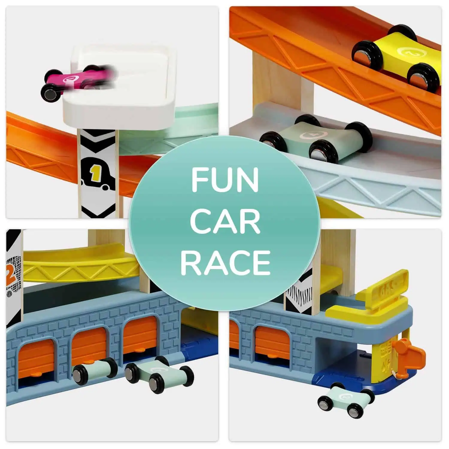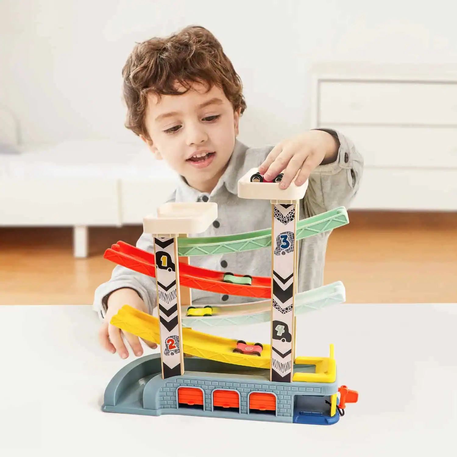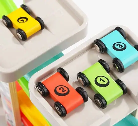 Die TOPBRIGHT Auto Rennbahn bietet Kleinkindern ab 18 Monaten aufregenden Spielspaß. Mit vier farbenfrohen Holzautos können Kinder die vier Ebenen der Rennstrecke hinuntersausen und dabei ihre Feinmotorik und Hand-Augen-Koordination verbessern. Zusätzliche Features wie zwei Parkdecks, drei Garagen und eine Werkstatt mit Tankstelle regen die Fantasie an und fördern kreatives Spielen. Die stabilen Materialien aus Buchenholz und Polypropylen sorgen für Langlebigkeit und Sicherheit. Dieses Spielset ist ideal, um spielerisch Farben und Zahlen zu lernen und bietet stundenlangen Rennspaß.