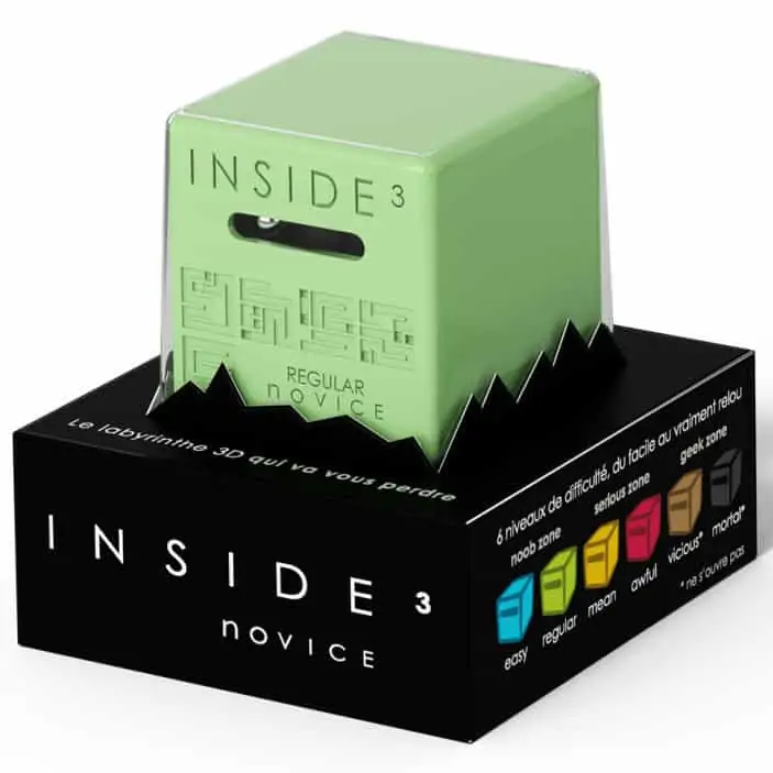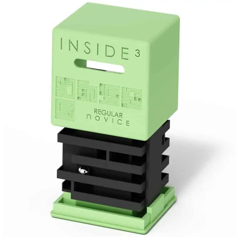 INSIDE3 sind 3D-Labyrinthe im Würfel: Die Kugel verschwindet im Dunkeln – und ihr führt sie durch mehrere Ebenen bis zum Ausgang. Je nach Reihe variieren Größe, Ebenenzahl und Schwierigkeitsgrad; einige Modelle lassen sich öffnen, die härtesten bleiben versiegelt.