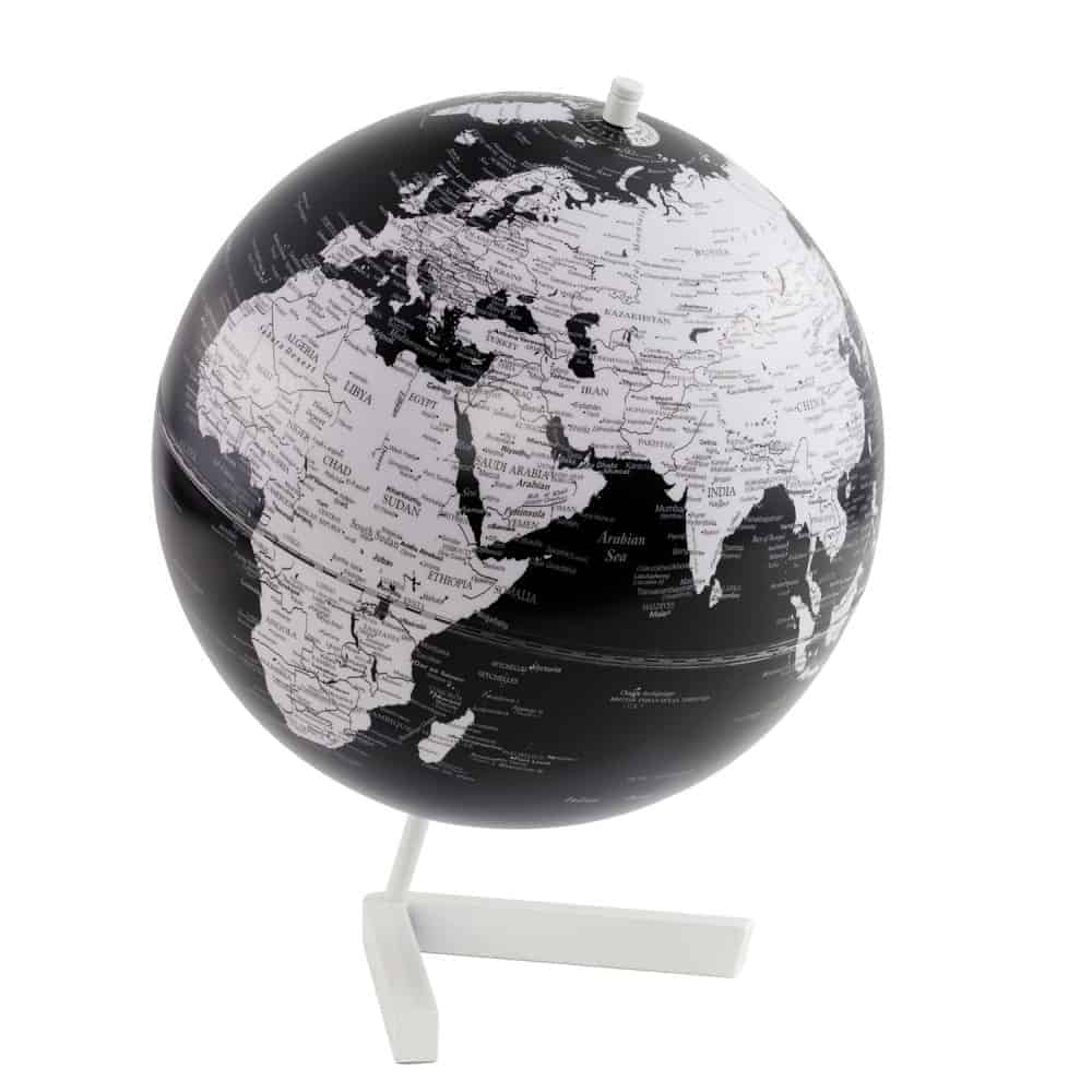 Der Kontrast von hellen und dunklen Farben kennzeichnet den Emform Globus ORBIT WHITE. Denn während bei dem stilvollen Accessoire die Meere der Welt auf dem Globus in schlichtem Schwarz gehalten sind, erscheinen Kontinente in klarem Weiß. Und auch der Ständer aus Metall zeigt sich in mattem Weiß, was die Eleganz des Globus ausmacht. Mit einer Höhe von 400 mm und einem Durchmesser von 300 mm kann der Globus ORBIT WHITE auf jedem Tisch oder Schrank einen festen Platz finden und weltgewandten Menschen Unterhaltung bieten.