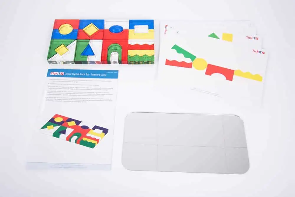 Das Set enthält wunderschön polierte, durchsichtige Acrylblöcke in verschiedenen Formen, einen ebenen Spiegel, 15 Arbeitskarten und eine Anleitung. Die glatten, farbenfrohen Blöcke sind so konzipiert, dass du die Welt der Farben und des Lichts erkunden kannst.