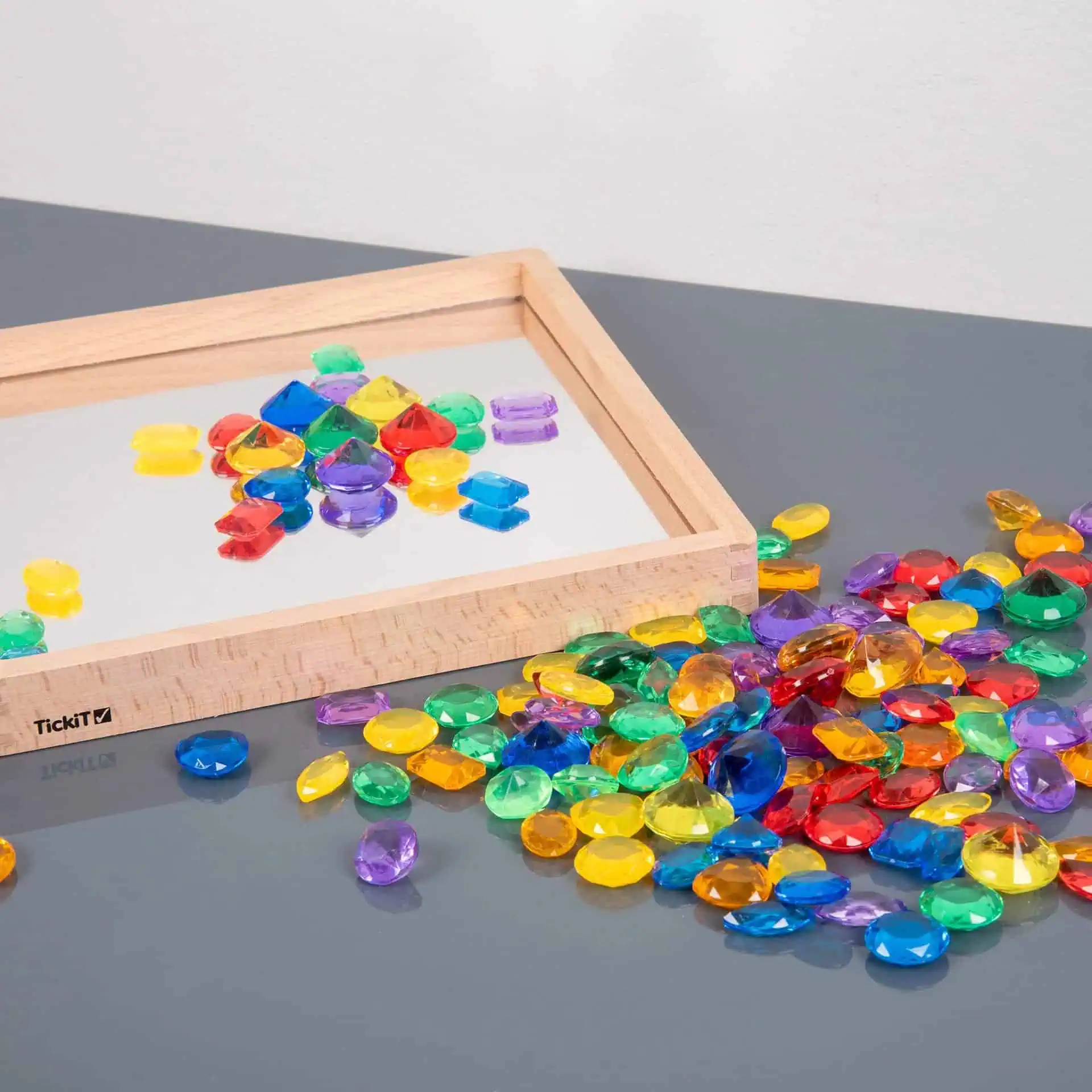 Das TickiT® Set enthält 144 durchscheinende Juwelen in 8 verschiedenen Formen und 6 leuchtenden Farben, ideal für Zähl-, Sortier- und Musterbildungsaktivitäten.