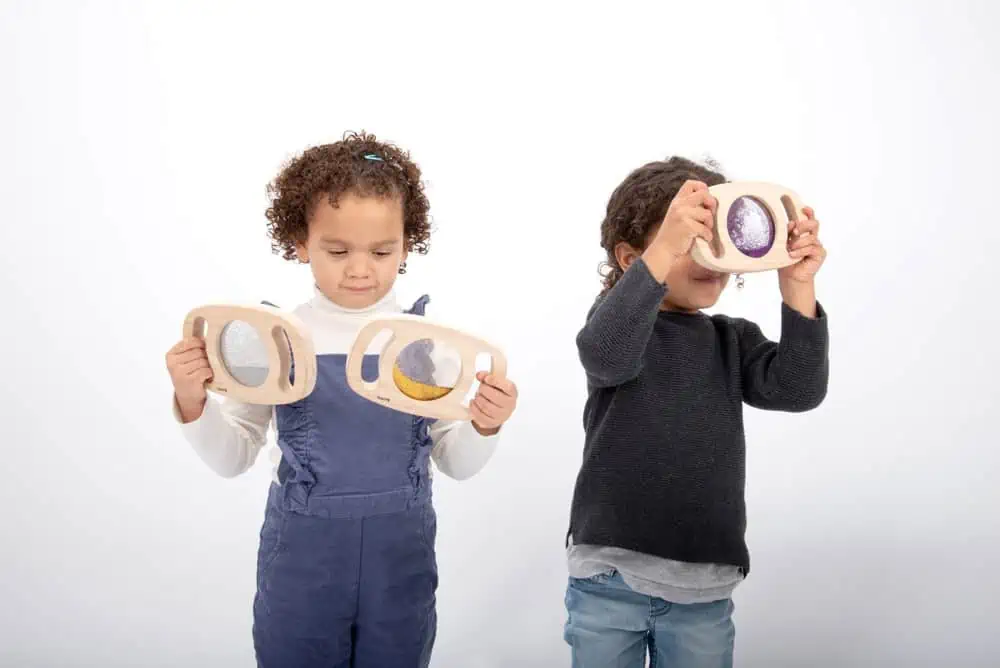 3 transparente, farbige Acrylscheiben in einem Holzrahmen mit Griffen zum Durchgucken. Mit Glitzerstaub gefüllt.