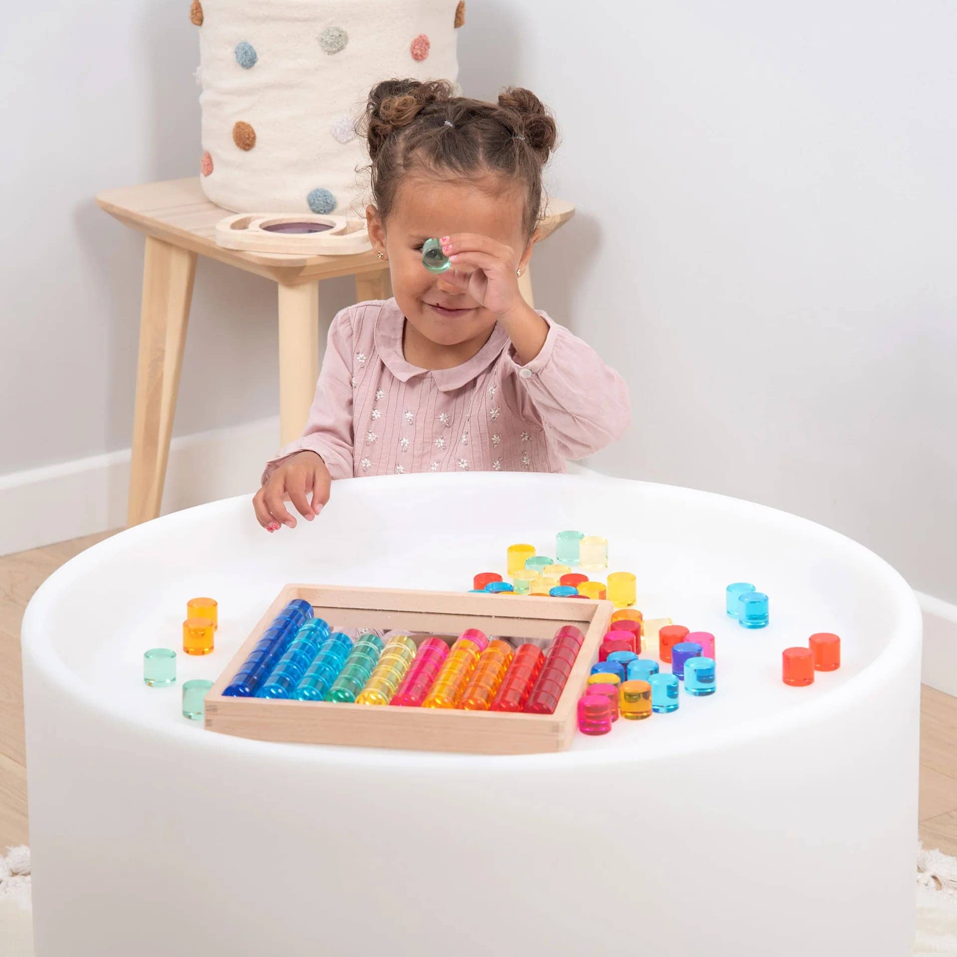 Das TickiT® Edelstein-Kreis-Spiegel-Tablett enthält 100 transparente Acryl-Edelsteinkreise in leuchtenden Farben – perfekt für sensorische Spiele, Farberkennung und kreatives Bauen.