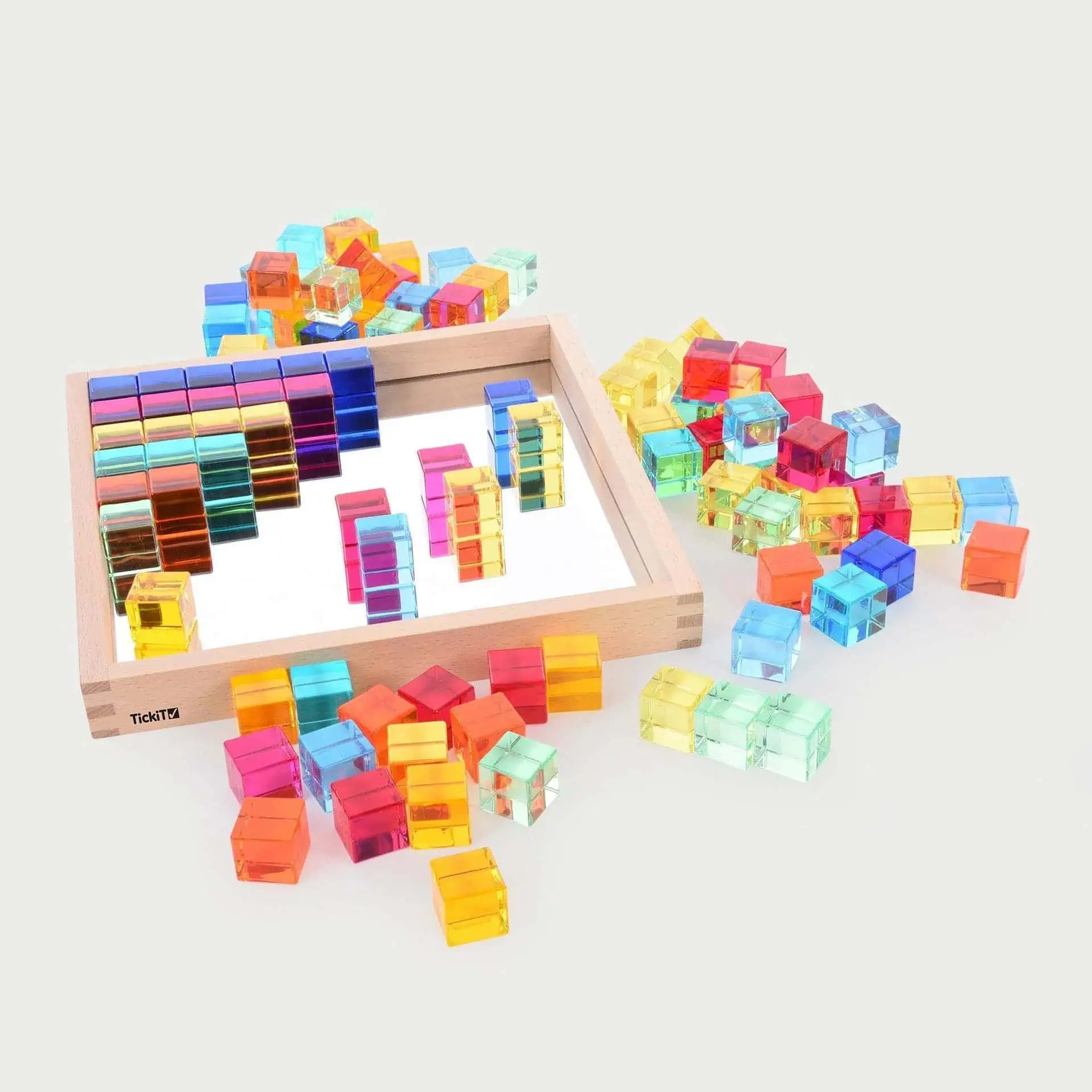Entdecke 100 farbige Edelsteinwürfel im Holztablett mit Spiegelboden – ideal für fantasievolles Spiel, Lichttische und Farberkennung.