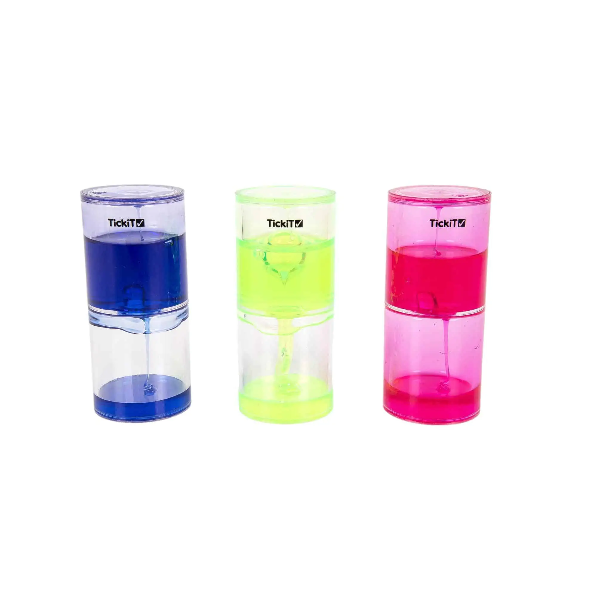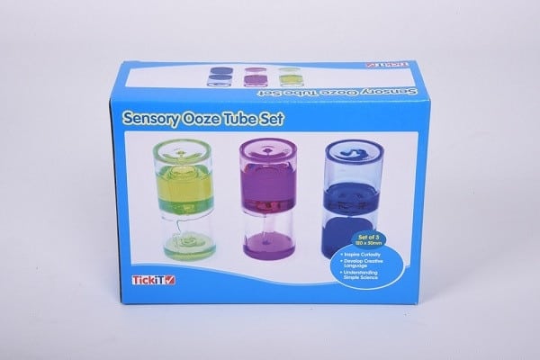 Kennst du schon das Tickit Sensory Ooze Tube Set? Es besteht aus drei Röhren in blau, pink und grün, die mit einer dicken, klebrigen und ungiftigen Flüssigkeit gefüllt sind. Die Flüssigkeit bewegt sich langsam nach unten und bildet dabei wunderschöne Spiralen. Das sieht so cool aus!
