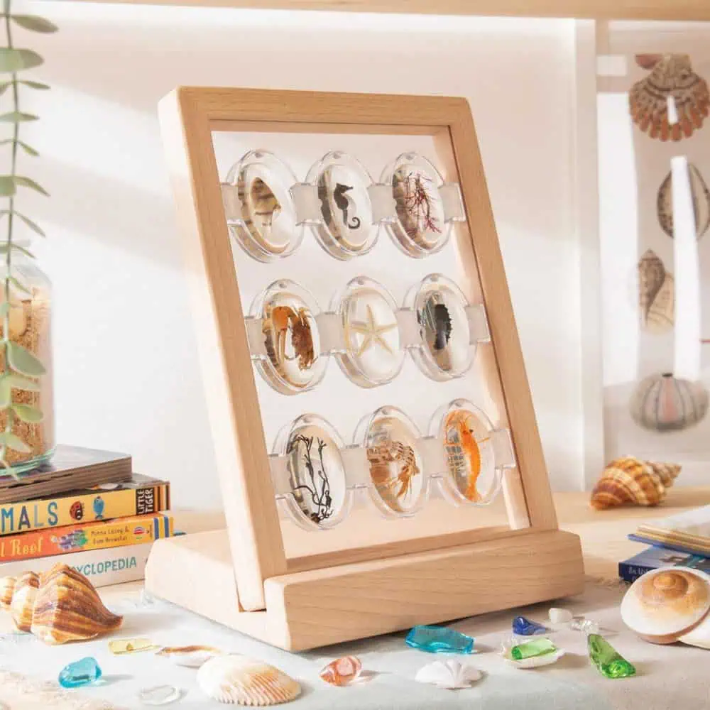 Der Specimen Stones Tabletop Stand bringt Ordnung und Sichtbarkeit in Natur- und Sachkunde-Themen. Aufrecht präsentiert, bleiben bis zu 9 Steine jederzeit greifbar und gut erkennbar – ideal für Impulsrunden, Stationenlernen und freie Exploration. Die stabile Buchenholz-Basis sorgt für sicheren Stand; das Polycarbonat-Display schützt und hält die Steine übersichtlich ausgerichtet. Perfekt für Kita, Grundschule und Zuhause – als Ergänzung zu allen Specimen Stones-Sets.