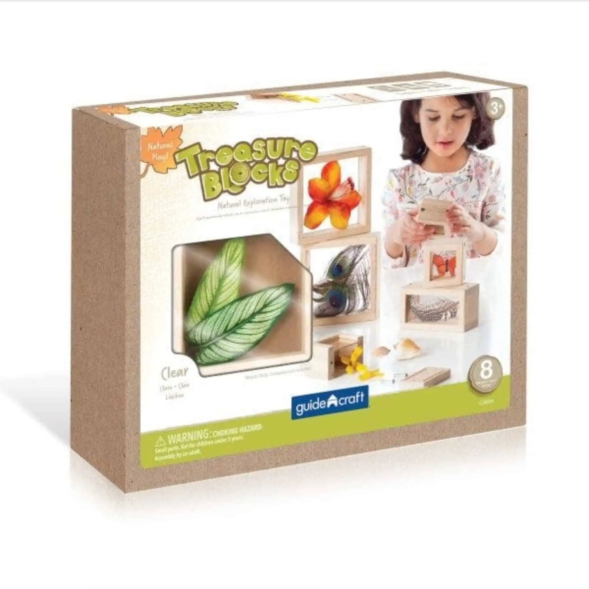Die Guidecraft Schatzblöcke sind transparente Holzbausteine mit Acrylfenstern, die das Sammeln und Präsentieren von kleinen Objekten ermöglichen. Set aus 8 stapelbaren Blöcken.